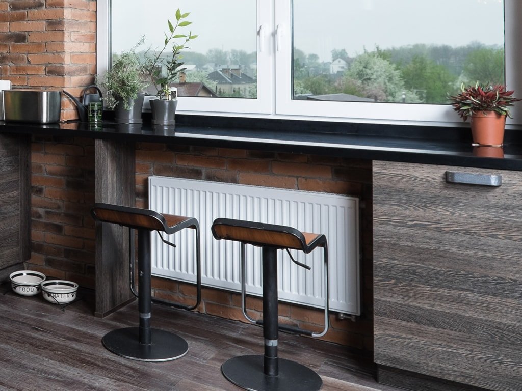 El radiador debajo de la encimera será una adición agradable en el invierno: la persona que trabaja en la mesa no tendrá que preocuparse por calentar sus piernas, y el calor agradable dará una sensación de confort en el hogar.