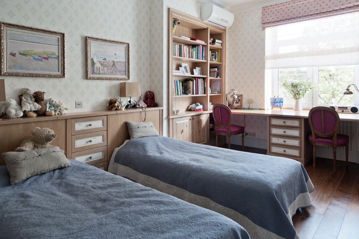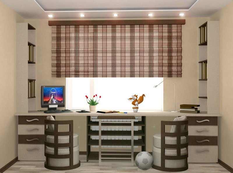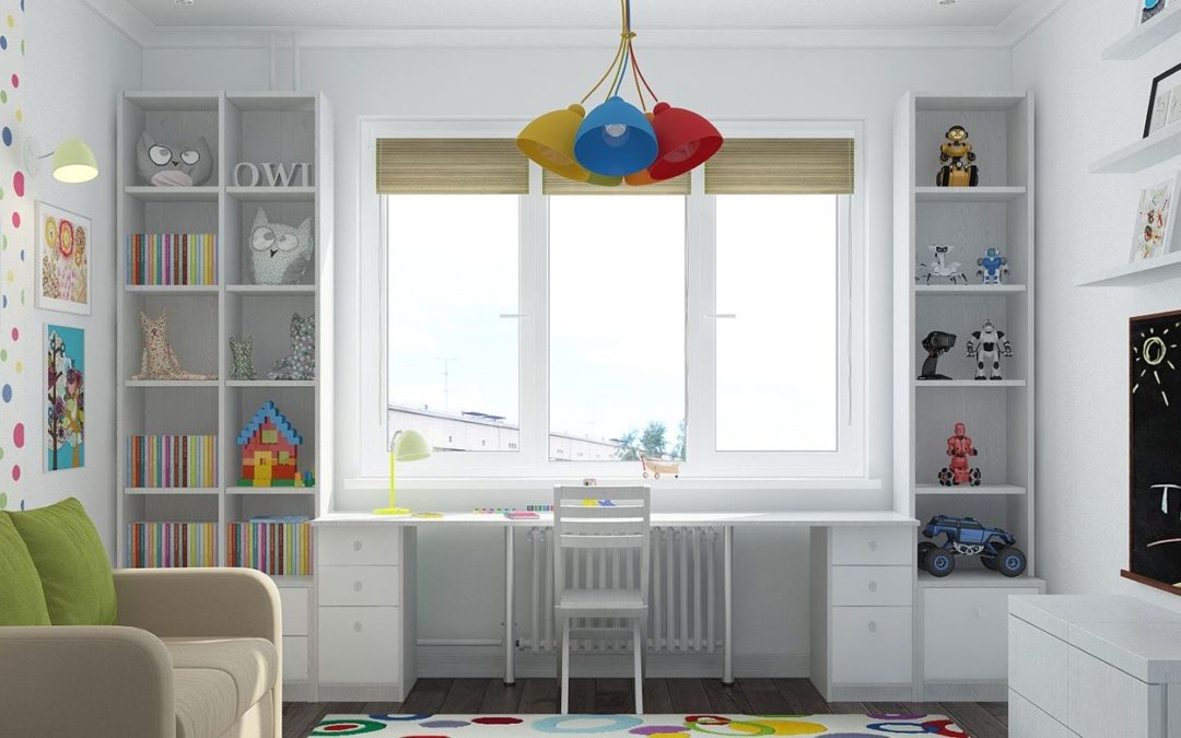 Un escritorio en la habitación de un niño o en la habitación de un adolescente es una opción de diseño simple y original. Desafortunadamente, las familias generalmente no pueden proporcionar un área grande para sus hijos.Un niño generalmente tiene que acurrucarse en una habitación pequeña, pero al mismo tiempo necesita equipar varias zonas funcionales a la vez. Para las migajas, un patio de recreo es suficiente, donde combinará entrenamiento y entretenimiento. El estudiante ya necesita un lugar completo para estudiar. Si combina la mesa larga incorporada cerca de la ventana con una pequeña caja de lápices, obtendrá un lugar de trabajo acogedor con buena luz natural. Otra opción simple pero elegante para un estudiante es una mesa de esquina que se extiende desde el alféizar de la ventana anterior y "entra" en la pared más cercana. En una encimera tan larga, puede colocar varias zonas al mismo tiempo: para la creatividad y los juegos, para escribir y leer, para la computadora.