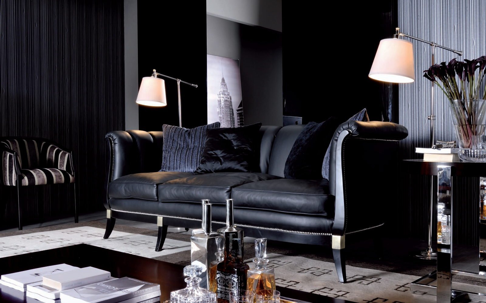 Los muebles tapizados tapizados en colores oscuros merecen especial atención: negro, chocolate, gris oscuro. La superficie de los sillones, sofás diseñados en una gama de este tipo, parece cara, especialmente cuando se trata de cuero. Solo los amantes de las mascotas deben evitar la tela oscura; los rastros de lana serán demasiado visibles en ella.