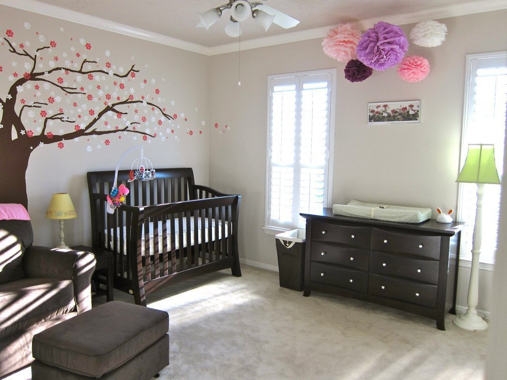 Los armarios oscuros se ven interesantes si están decorados con pegatinas de vinilo en contraste. Debajo de las puertas de vidrio puede colocar la impresión de fotos en forma de cuentos de hadas. Brillantes peluches aterrizaron en filas en estantes. No olvide agregar plantas verdes al interior: deben ubicarse en macetas de plástico ligeras fuera del alcance, además, deben estar a salvo del punto de vista de la toxicidad.