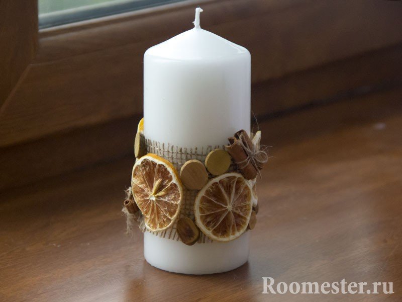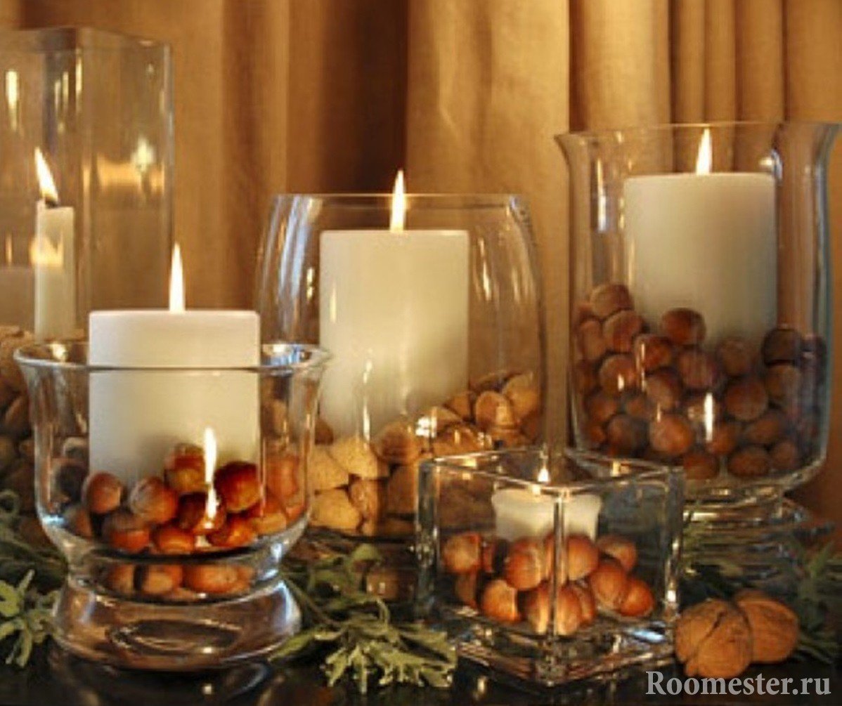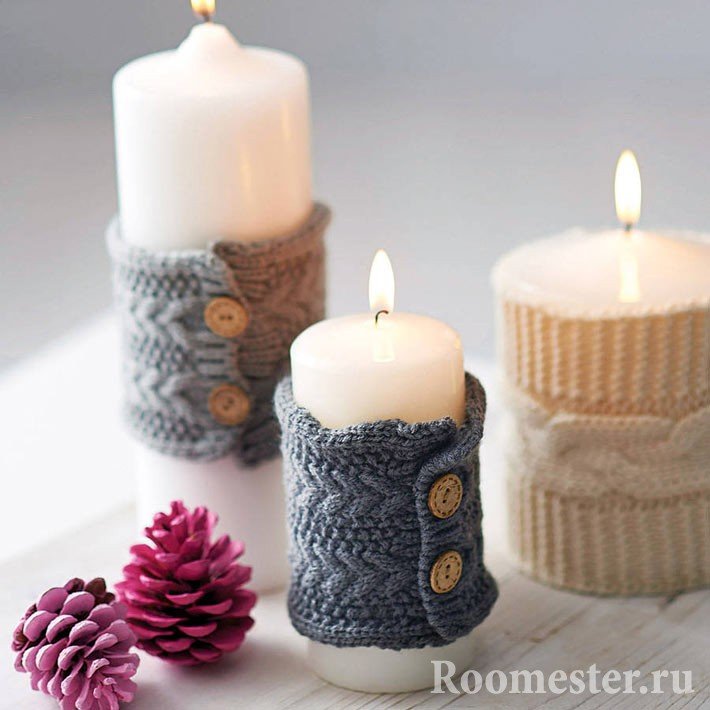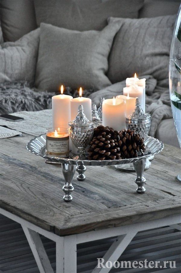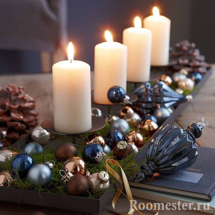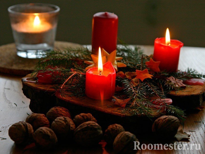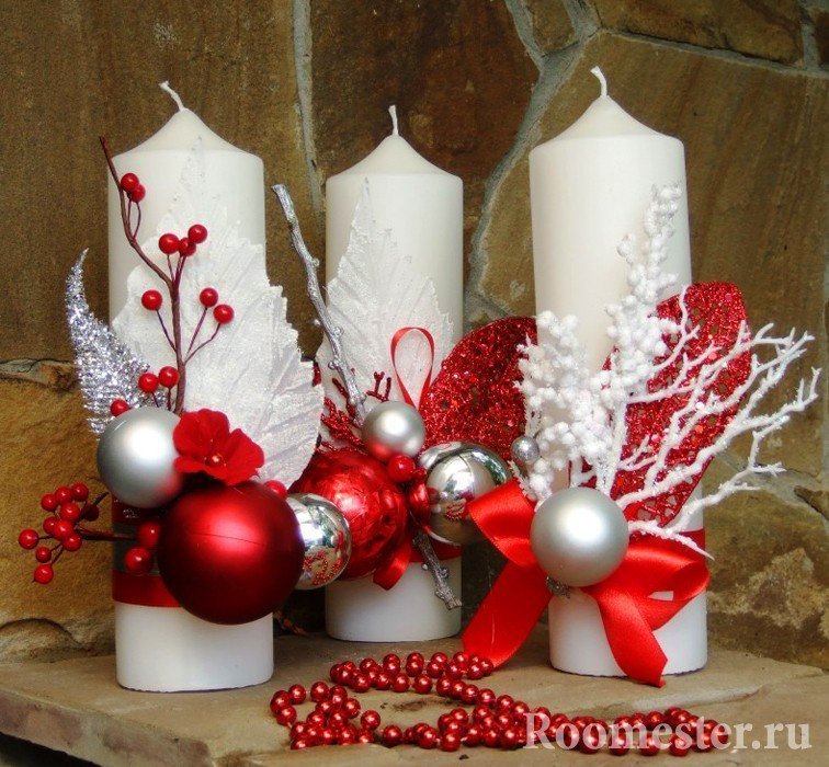 Candelabros La decoración de velas ocupa un lugar especial en la decoración de la habitación de Año Nuevo. Ambos vasos transparentes, en los que se colocan velas cortas, y se utilizan latas comunes, que están decoradas con pintura acrílica, decoupage, cintas de sujeción, pedrería, etc. El uso de coronas tradicionales alrededor de una vela también es relevante. El uso vale la pena aquellos materiales que decoran la parte principal de la habitación.