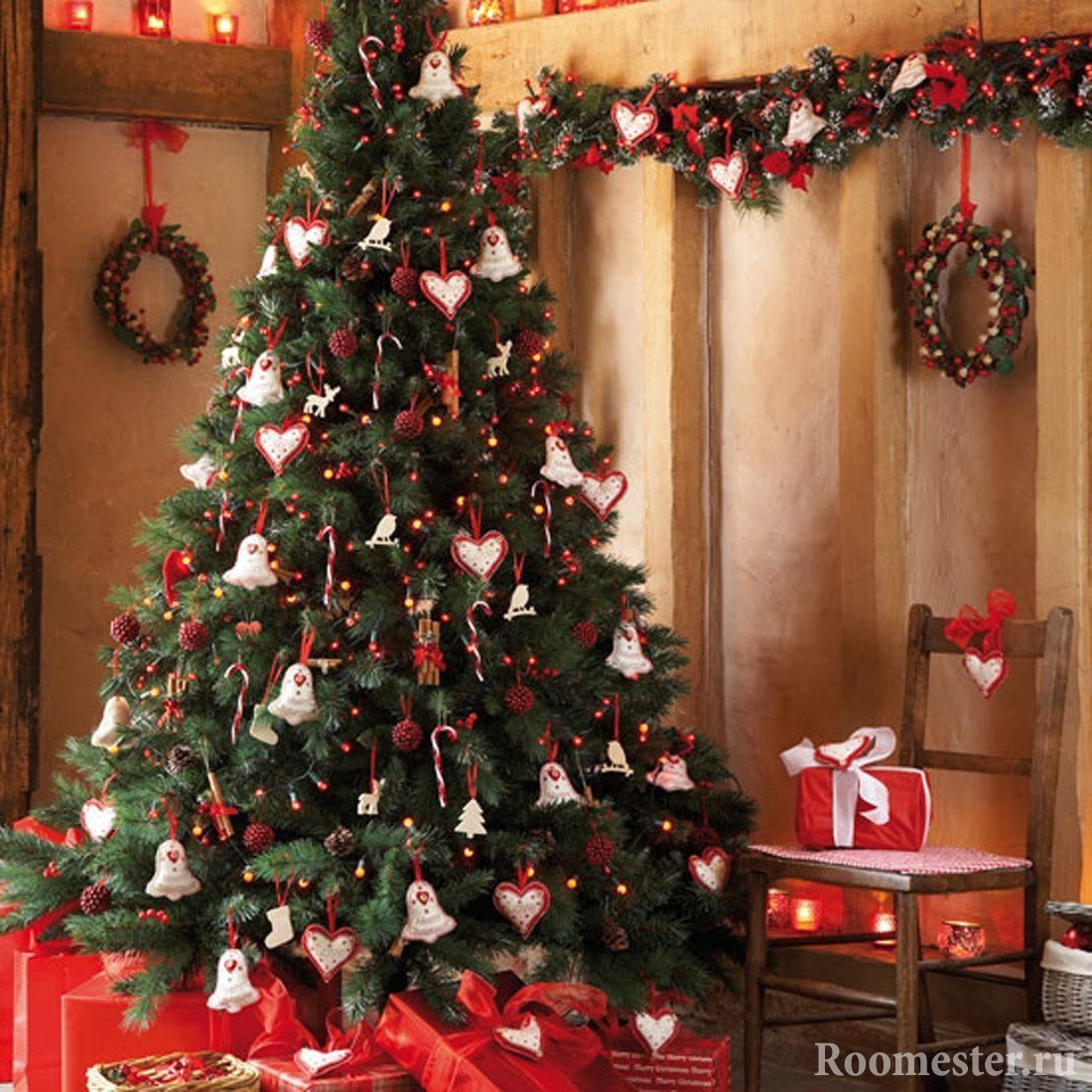 Será correcto que la decoración de la casa coincida con el estilo del árbol de Navidad, entonces toda la decoración no causará disonancia y la apariencia general será digna. La decoración de la habitación de bricolaje para el Año Nuevo se puede hacer con los elementos anteriores: guirnaldas, coronas, paneles, composiciones.