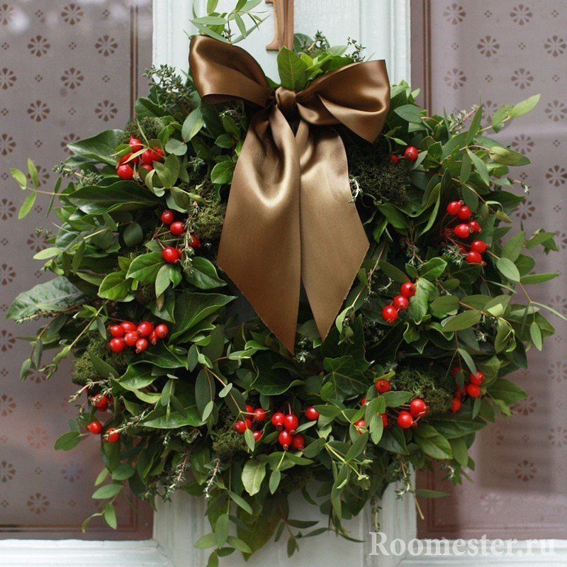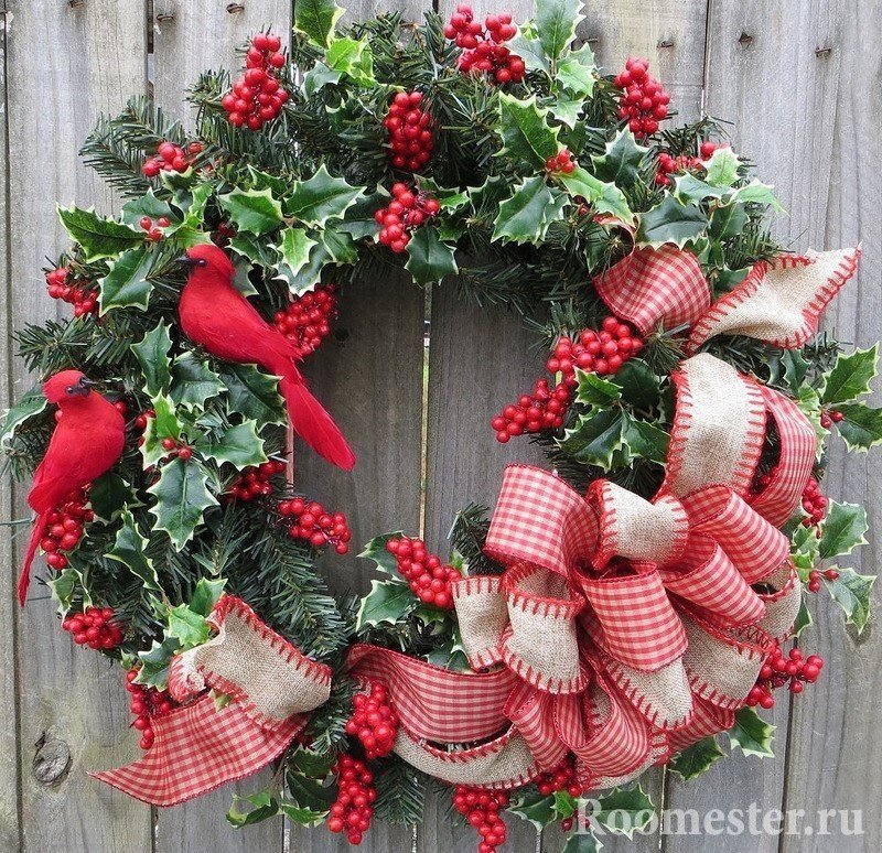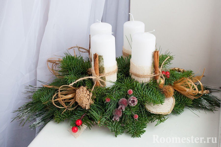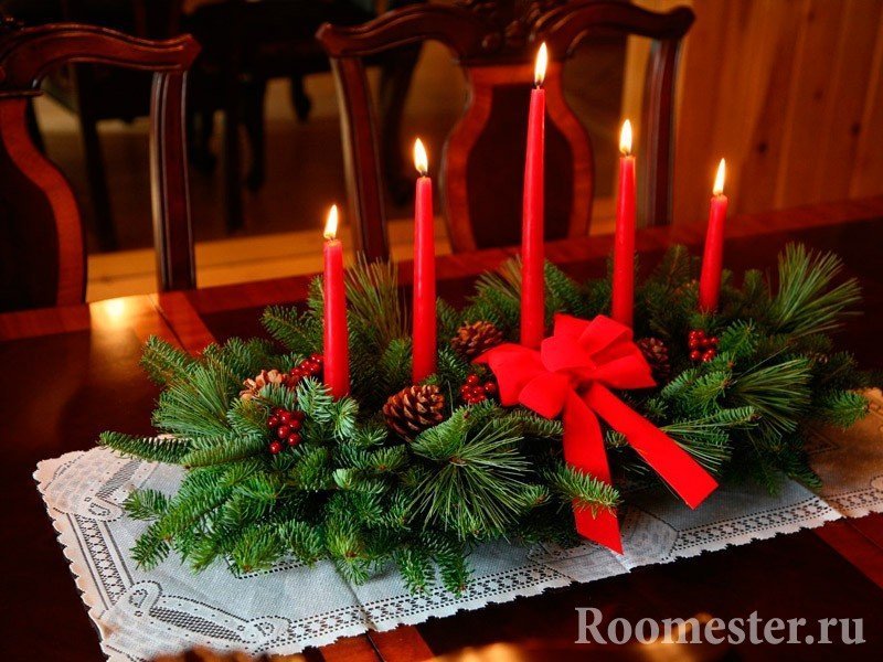 La decoración del hogar de Año Nuevo, que implica el uso de elementos de fábrica, se puede complementar con una corona de Navidad hecha independientemente, se puede colgar en una puerta o poner sobre una mesa como decoración para una vela.