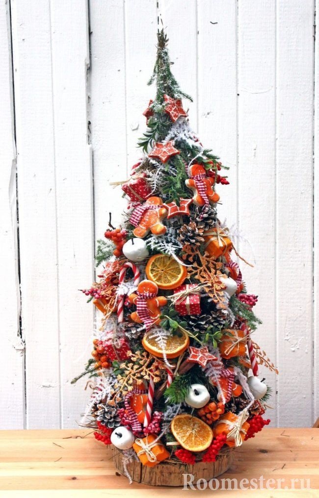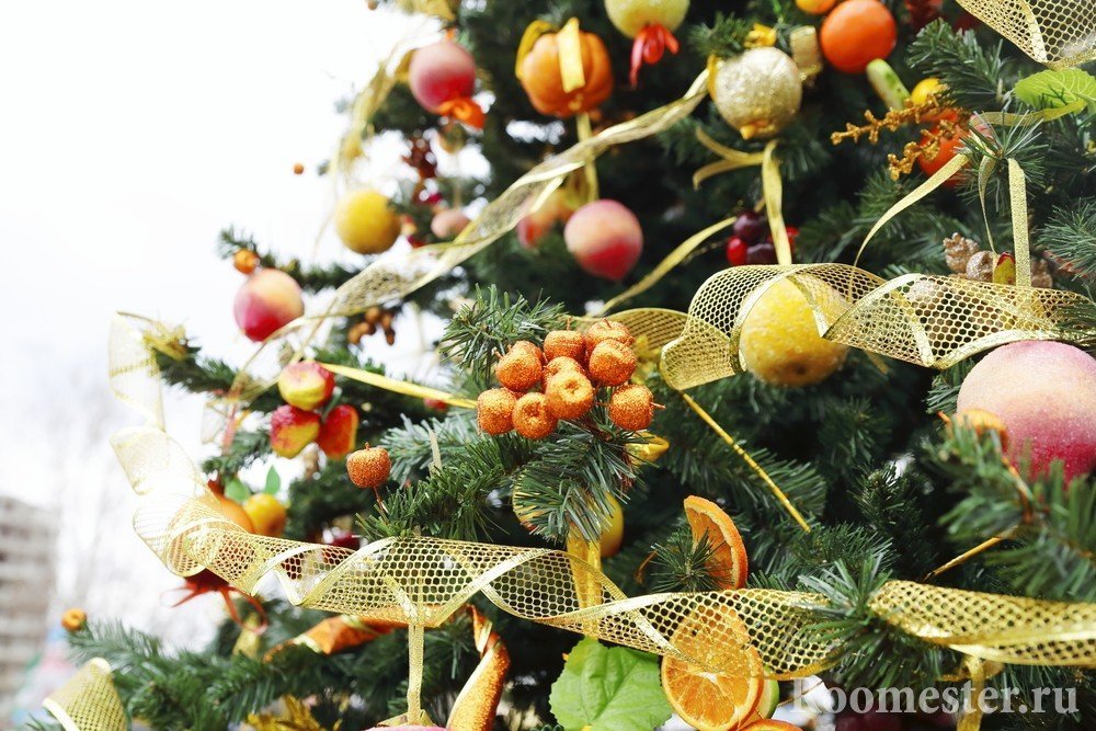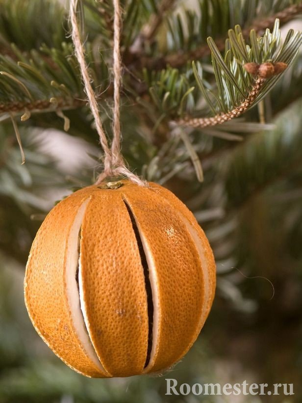Frutas confitadas y frutos secos. Las últimas tendencias son decorar el árbol con frutas secas (por ejemplo, anillos de piña, rodajas de kiwi, rodajas de naranja, limón). Tales muestras en combinación con el olor a agujas llenarán la habitación con un aroma especial.