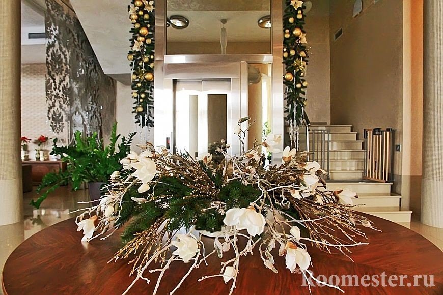 Una tendencia reciente que lleva el diseño de Año Nuevo a un nuevo nivel ha sido varias composiciones que colocan la habitación en superficies: soportes, cajoneras, alféizar.