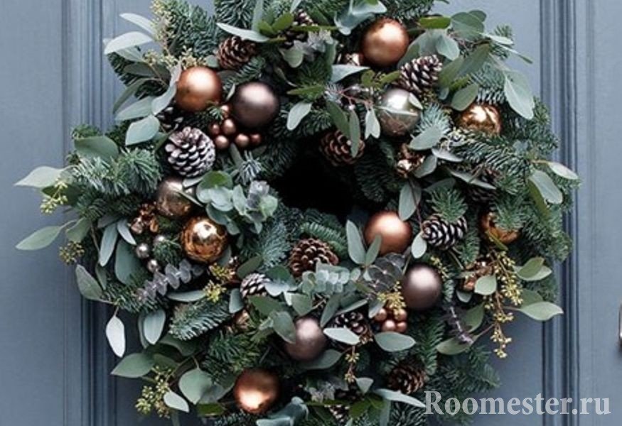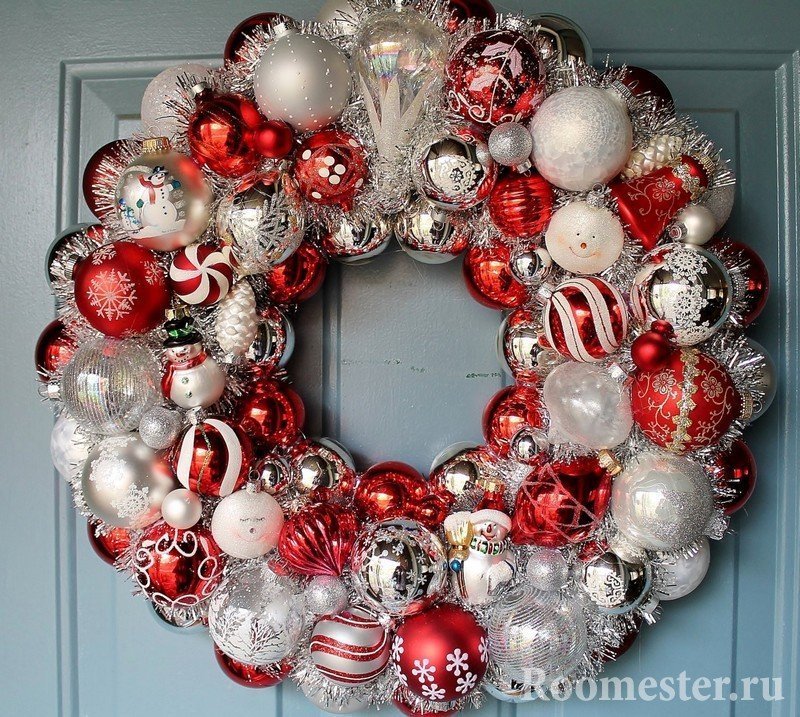 Habiendo adquirido bolas, pueden convertirse en un elemento elegante de decoración. Para hacer esto, necesita un marco (alambre, ratán, anillo de espuma). Después de elegir la versión deseada de la base debajo de la corona, se unen las bolas (es mejor elegir un diámetro medio o pequeño de hasta 5 cm) para que estén densamente dispuestas una a una. El punto final será una cinta atada en un lazo en la parte inferior de la corona.