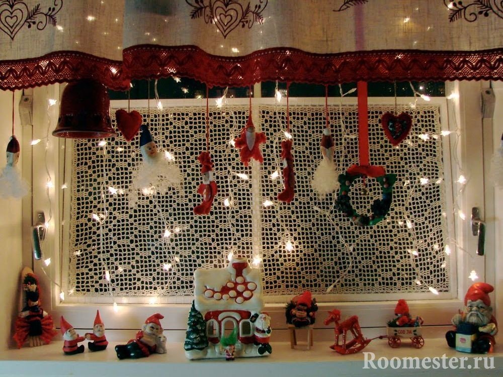 Las guirnaldas de luz familiares en las ventanas también se usan ampliamente. Solo que aquí no vale la pena hacer varias figuras de ellos. De manera concisa, las guirnaldas de estilo europeo se montan alrededor del perímetro del vidrio. Este arreglo encajará con estilo en cualquier interior.
