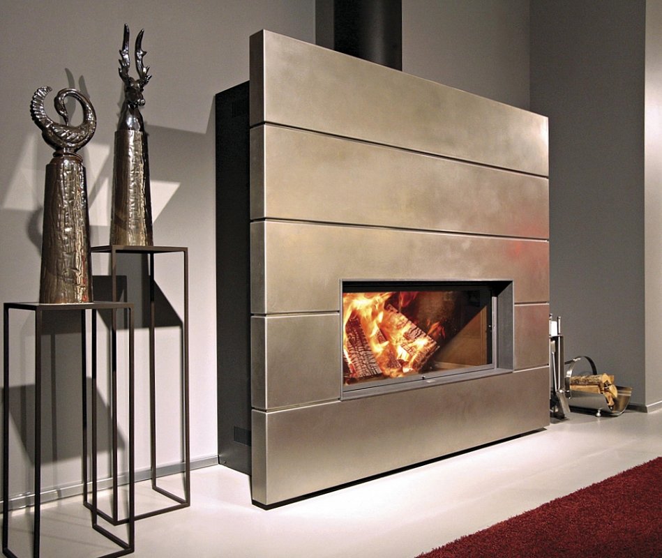 El diseño del hogar revestido con láminas de metal es adecuado para muchos estilos de interiores modernos. Los acabados más populares son de acero inoxidable, cobre y latón, la técnica de decoración es brochado, persecución (incluido manual), grabado artístico y corte por plasma. Los metales son fáciles de combinar con piedra natural o artificial, yeso. Las ventajas indudables de este acabado son el peso relativamente bajo de los detalles, la capacidad de diseñar una chimenea en casi cualquier estilo interior (retro, clásico, de alta tecnología, etc.) sin reconstruirla por completo. Un edificio independiente hecho completamente de metal es fácil de conectar, colocar en cualquier lugar del espacio. Las principales desventajas son la probabilidad de quemaduras graves al tocar una superficie metálica, el calentamiento desigual de la habitación y el enfriamiento rápido.