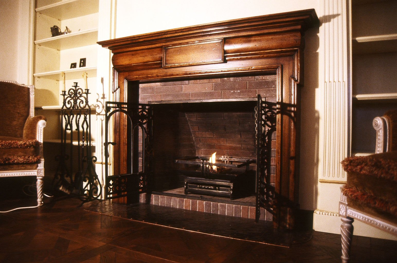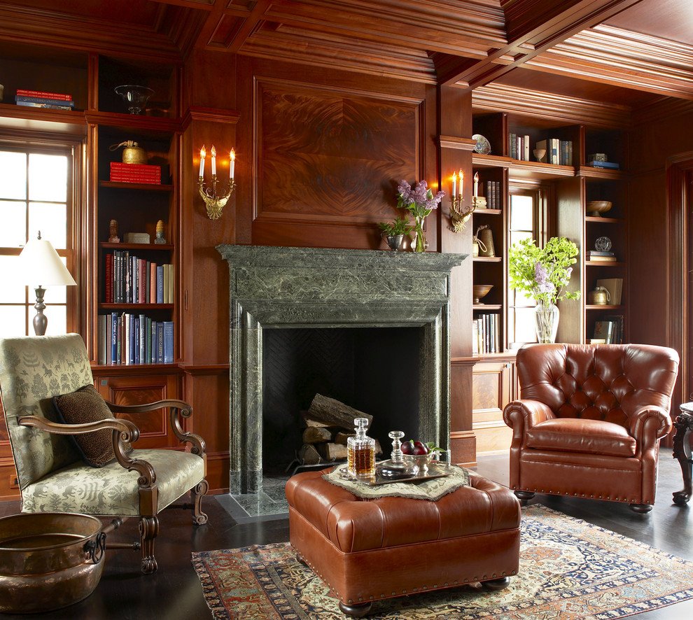El hogar en el estilo inglés está hecho en forma de U, equipado con una gran caja de fuego, amplia repisa de chimenea. Los materiales de acabado adecuados son especies de madera valiosas (wengué, zebrano, roble de pantano, abedul de Carelia, etc.) o su imitación de alta calidad, baldosas cerámicas, metal (elementos forjados). La mayoría de las líneas aquí son rectas, las esquinas son estrictamente rectas, todos los detalles tienen una forma regular estricta.