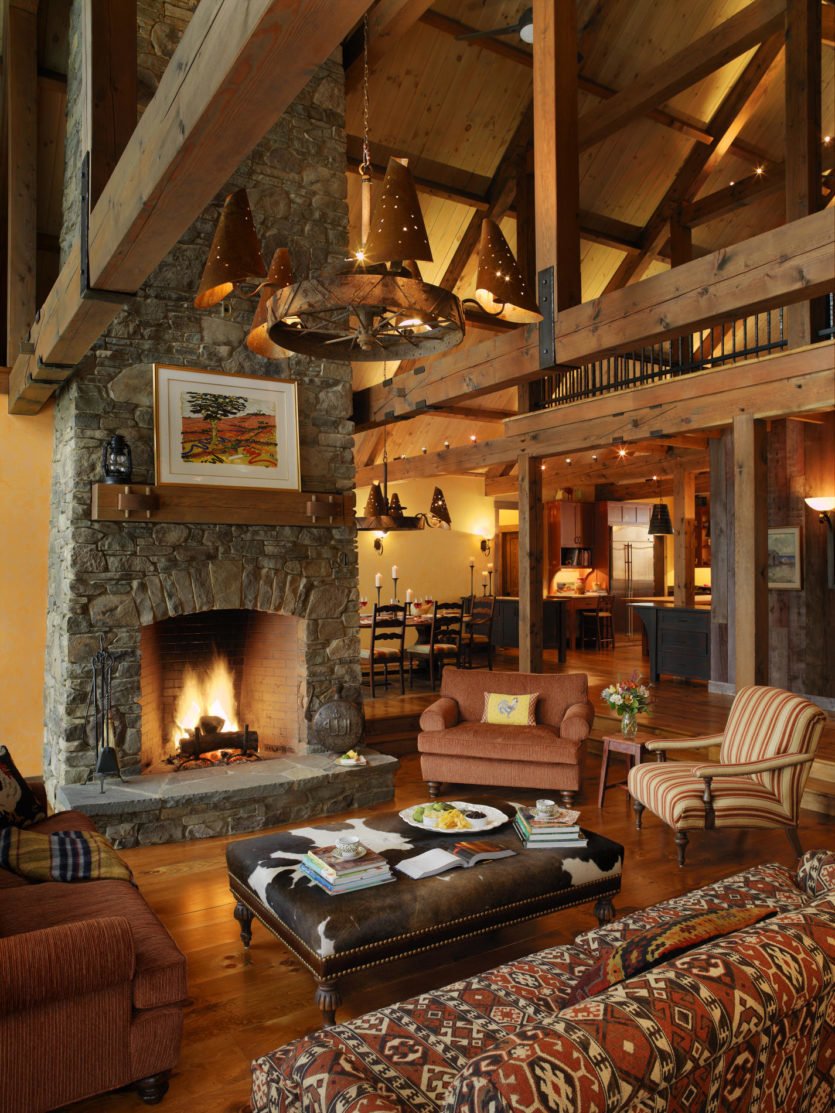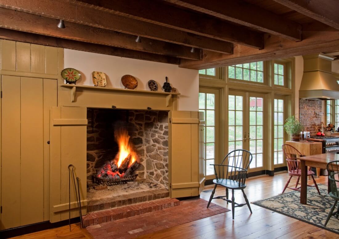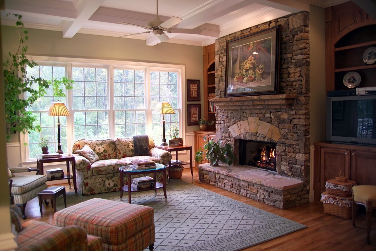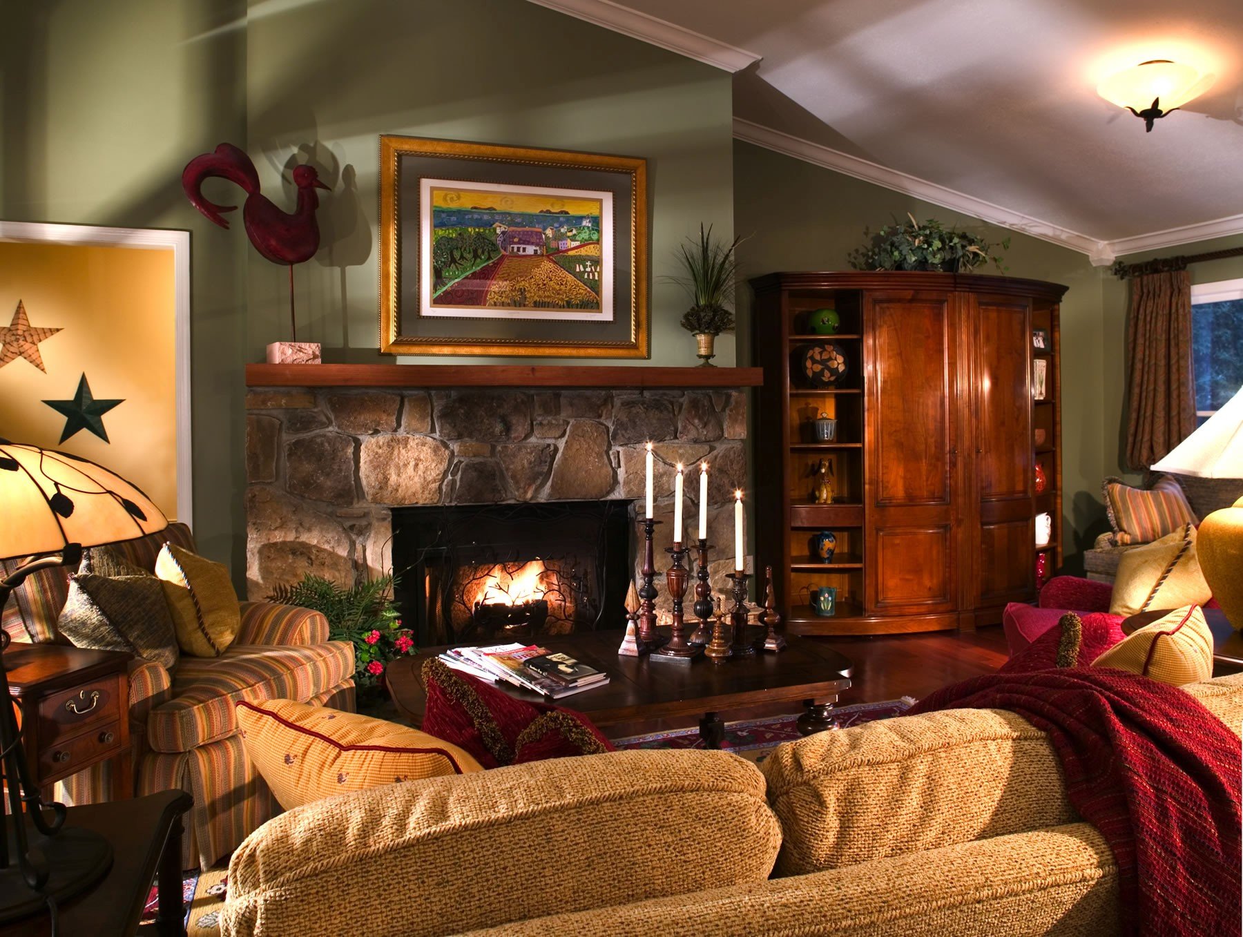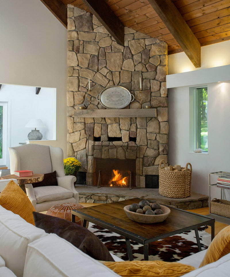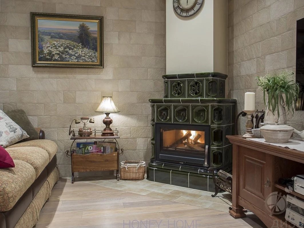 País: un estilo asociado con la sencillez y la comodidad rústica, porque la chimenea aquí está terminada "modestamente, pero con gusto". Este diseño es pesado, muy voluminoso, porque el acabado automático consume mucho tiempo. El portal en sí está hecho en forma de D, encima de la caja de fuego hay un haz grueso, la mayoría de las veces una piedra. La piedra natural envejecida artificial (roca de concha, piedra arenisca), ladrillo, imitación de piedra, ladrillo son adecuados para la decoración.