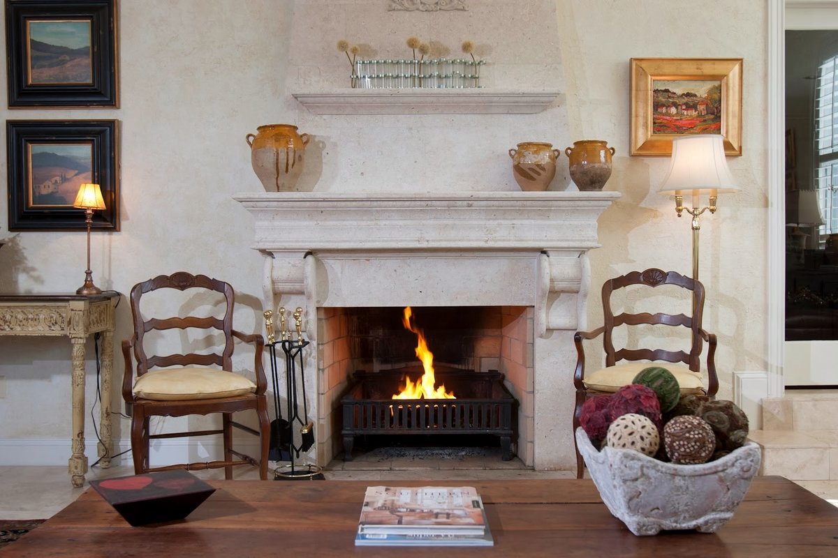 La chimenea provenzal tiene la forma más simple, pero cada detalle se resuelve tanto como sea posible. El color de construcción es generalmente blanco, otros colores adecuados son pastel, crema, rosa pálido, azulado, verde pálido.Como material, son adecuados el yeso decorativo, las baldosas cerámicas con motivos florales, las maderas claras, incluso las pintadas, envejecidas artificialmente. La forja también tendrá que estar en su lugar.