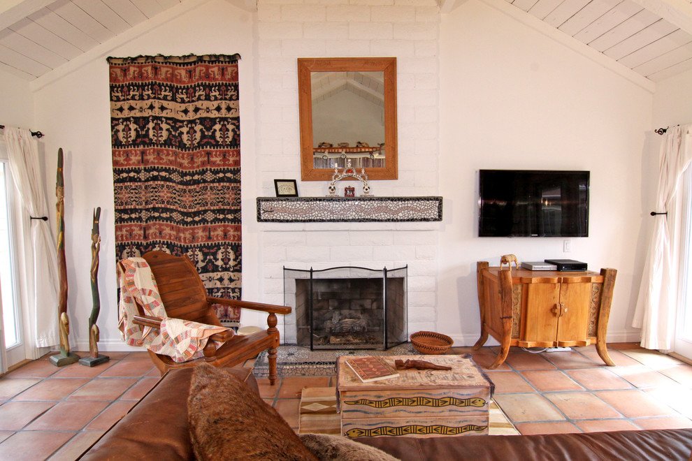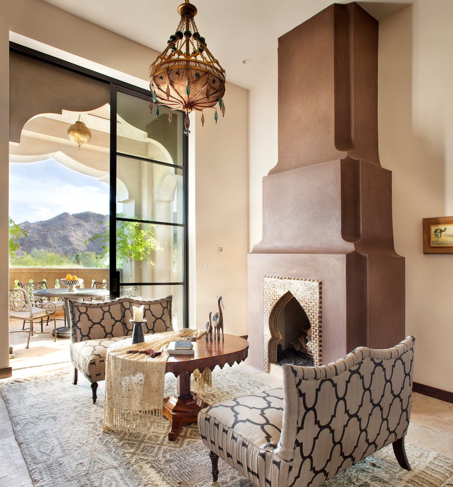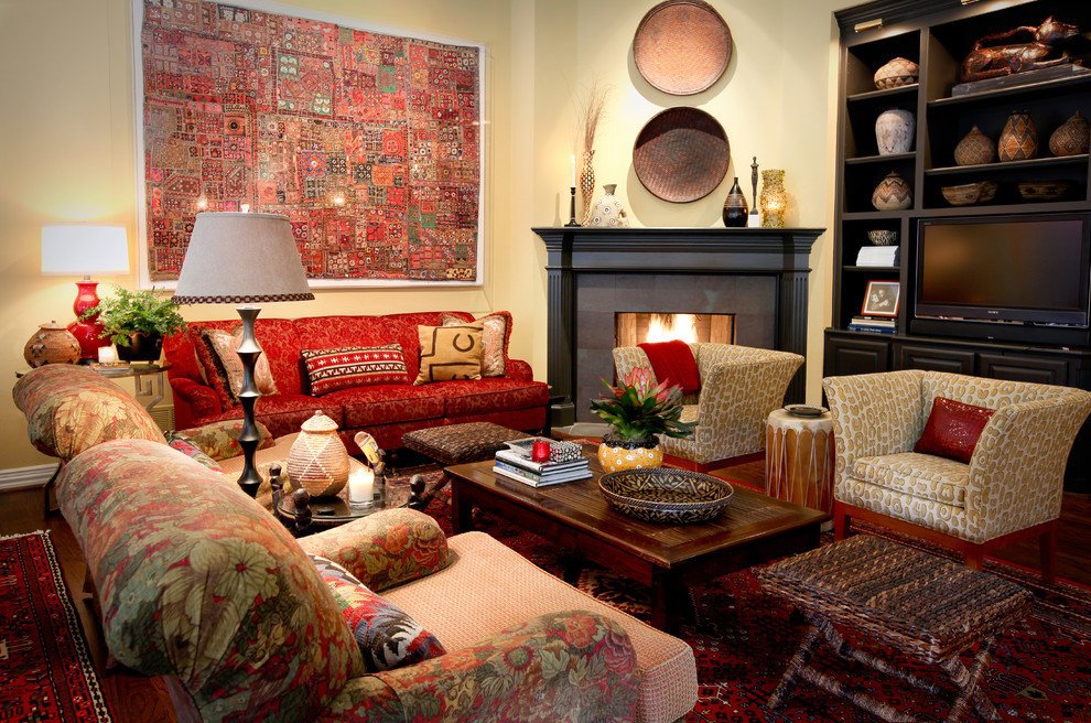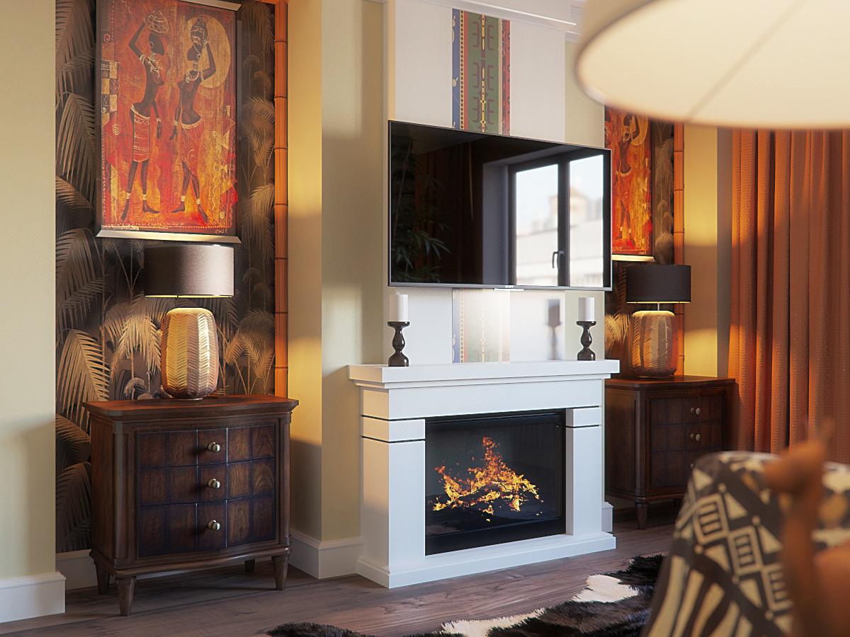 Chimeneas étnicas: diseños orientales multicolores y estrictos europeos. Con menos frecuencia, se trata de una imitación de la "estufa rusa" inscrita en el interior correspondiente. Los acabados populares incluyen yeso decorativo, blanqueado de tiza, arcilla mezclada con varios tintes y mosaicos de baldosas cerámicas de colores. Los patrones aquí están completamente ausentes, o son los más sinuosos, de varios colores.
