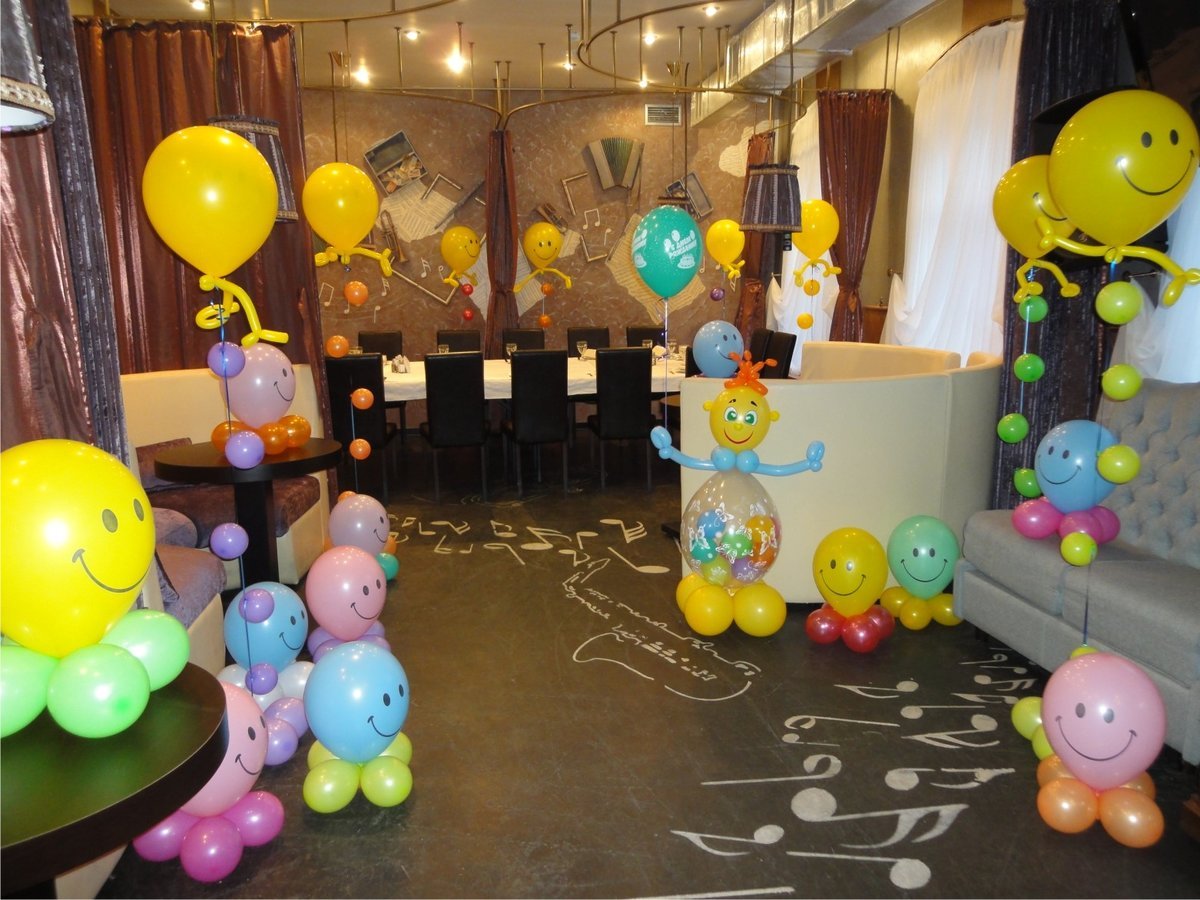 Los niños estarán encantados con las figuras ambulantes de su personaje de dibujos animados favorito. También les gustarán diferentes objetos, animales retorcidos de modelos para modelar. Para darle a los niños una intriga festiva, puede poner una bola sorpresa en el techo, puede contener dulces mezclados con bolas más pequeñas, en las que también se esconden los regalos.
