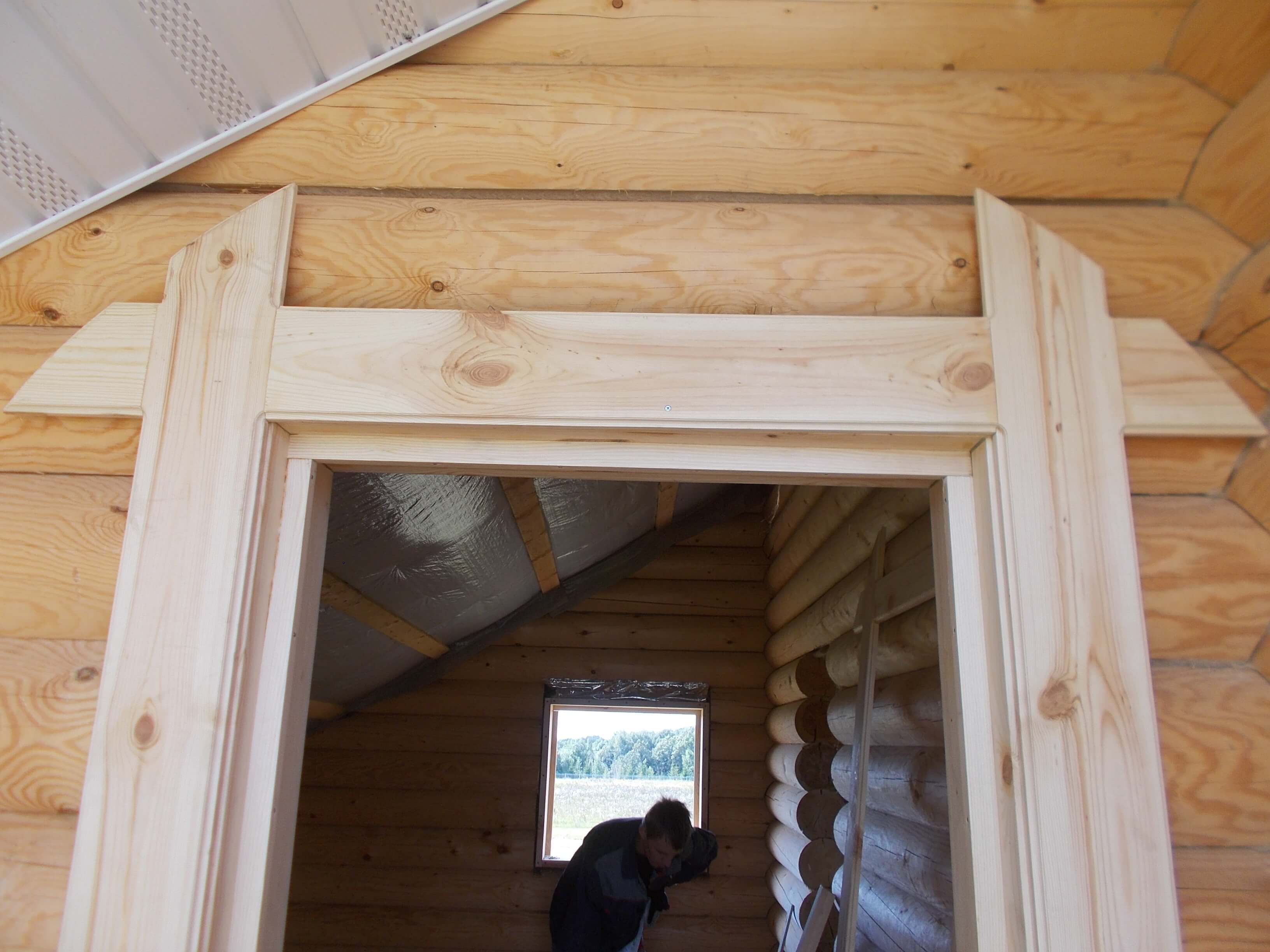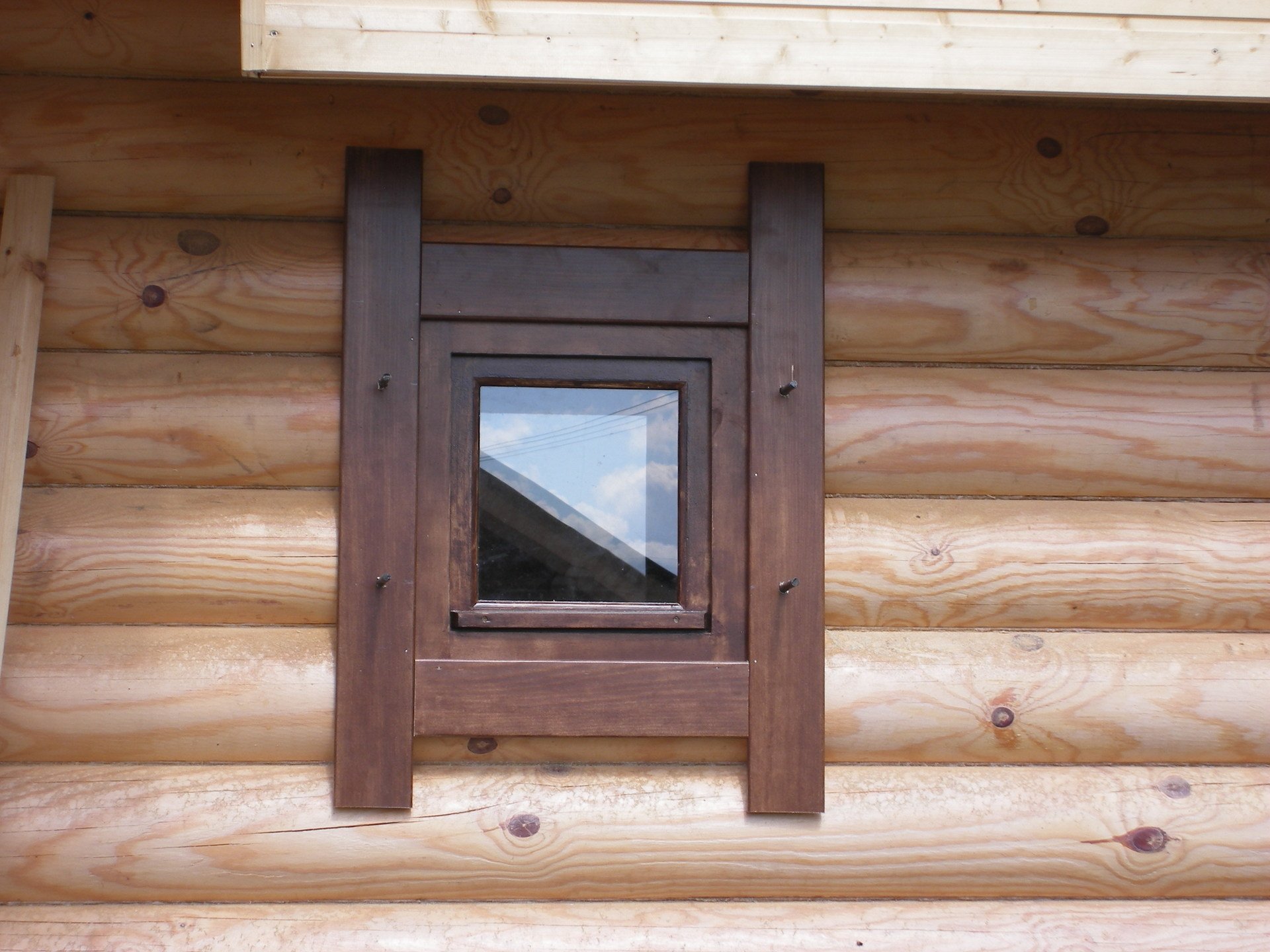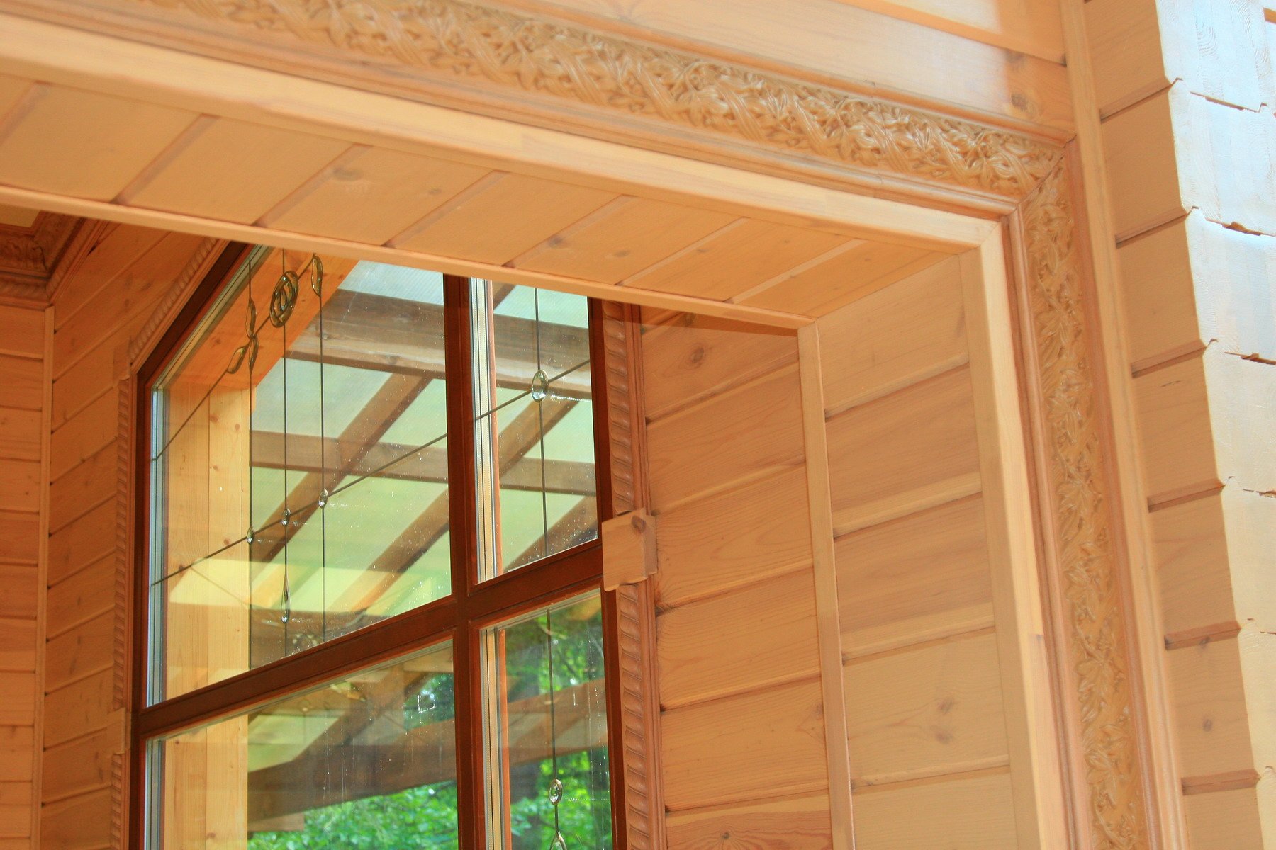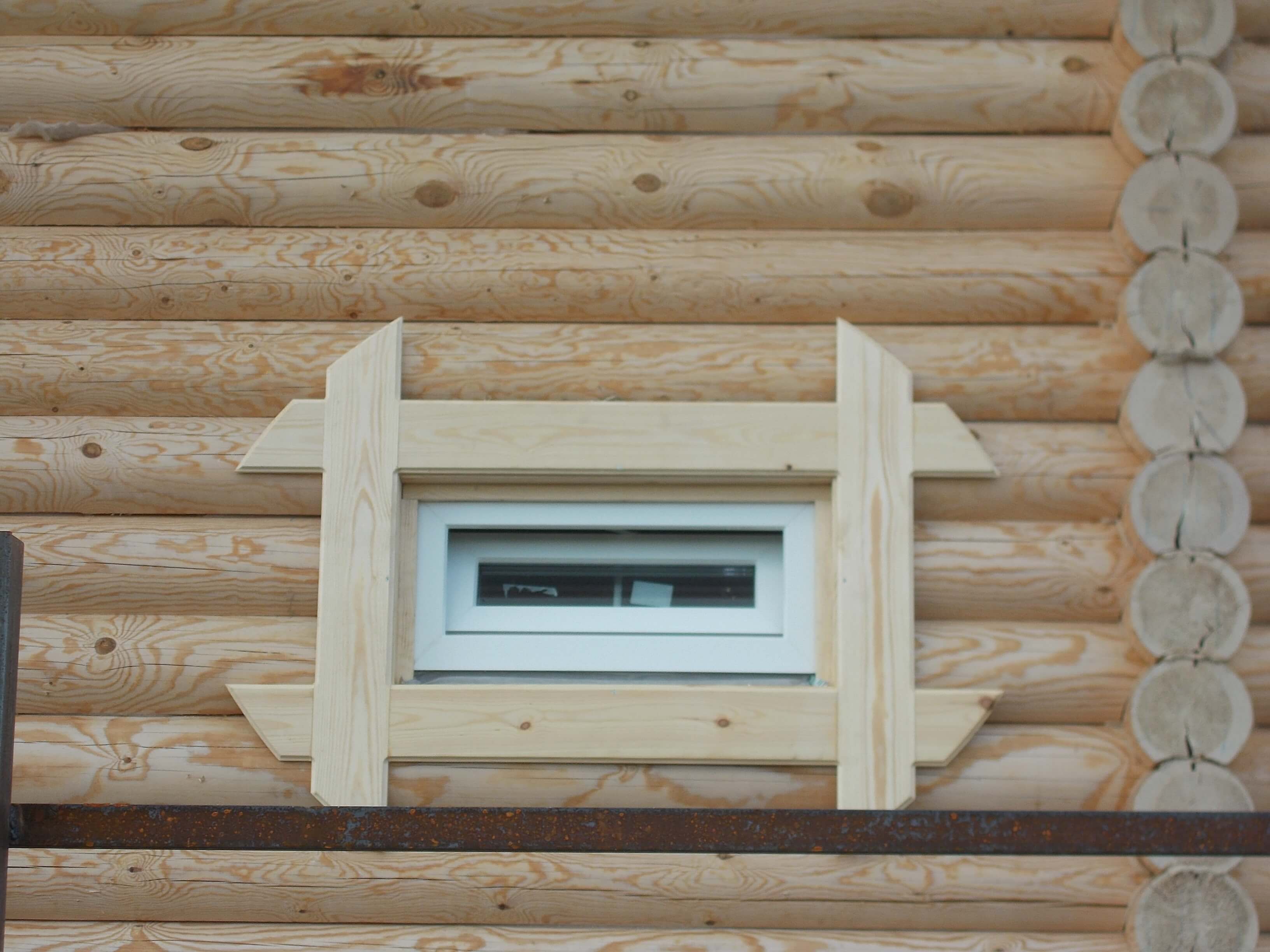 Inicialmente, los registros se cortan para obtener un área relativamente plana con huecos menores. Puedes alinearlos con masilla. El tamaño de las áreas eliminadas a lo largo del perímetro de la ventana debe ser igual al tamaño de las bandas de plataformas elegidas o literalmente 1-2 cm más grande (para marcos volumétricos y rizados).