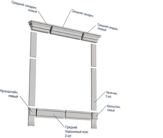 En esta realización, las plataformas están ubicadas debajo, arriba y a los lados del marco. Para algunos edificios, la moldura inferior y superior de las ventanas adyacentes (ubicadas en la misma pared a una pequeña distancia entre sí) puede ser común. En este caso, estos elementos se montan primero y las carcasas laterales se instalan después de un ajuste preciso.
