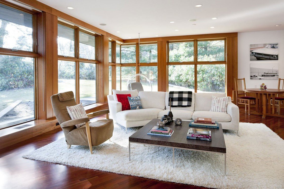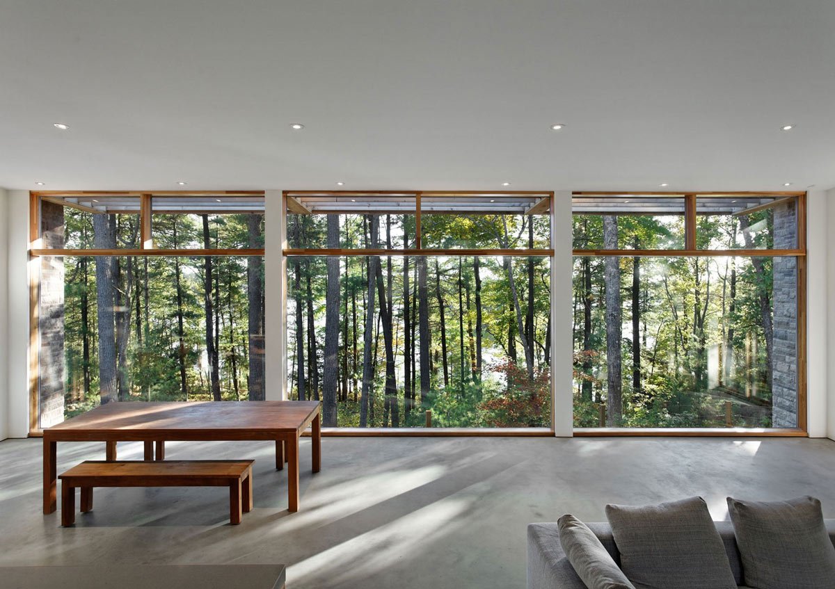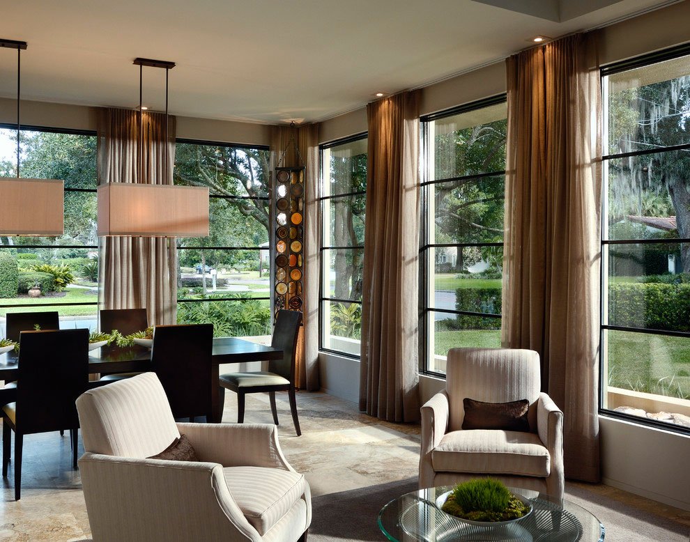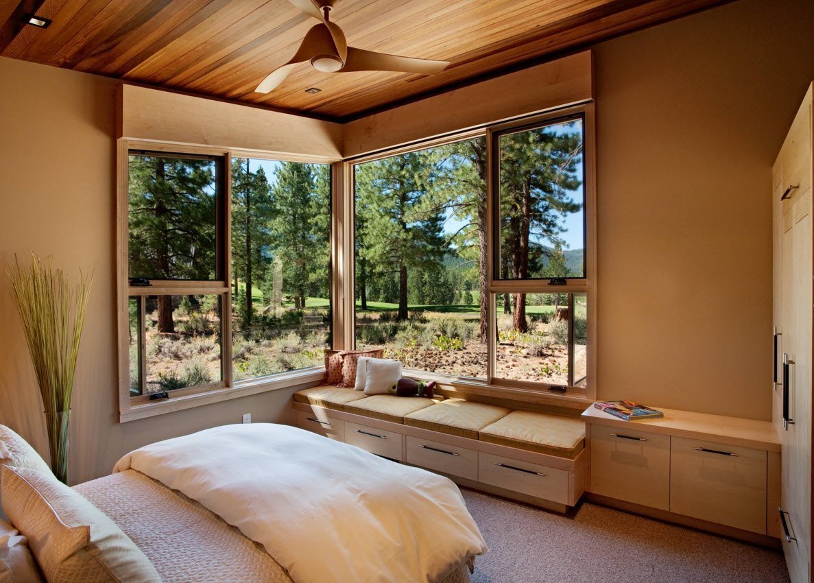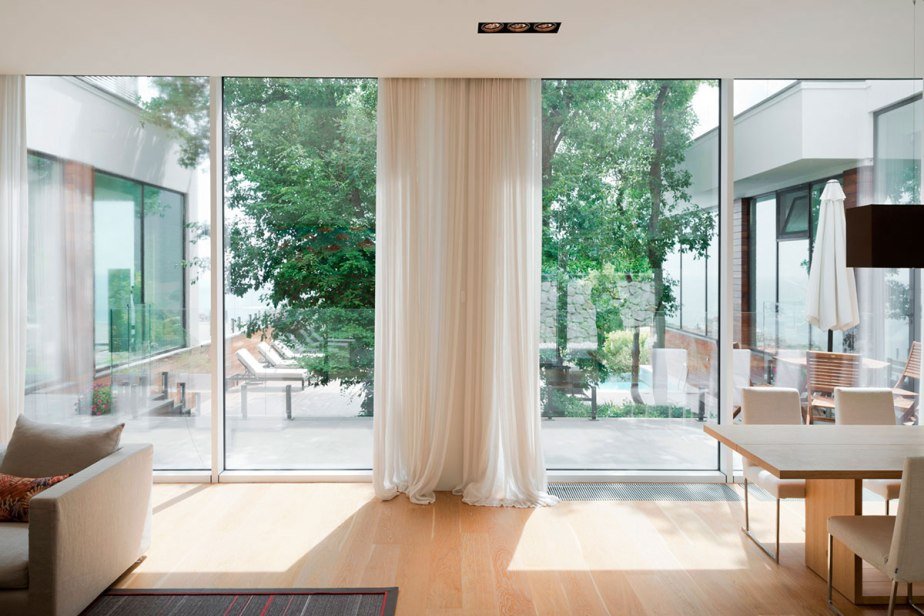 Hermosas vistas desde el exterior y el interior, buena luz natural son las principales ventajas de las ventanas panorámicas.Pero estas ventajas crean algunos aspectos negativos. Todos los movimientos alrededor de la casa serán visibles para los extraños. Corrija esta situación con ventanas transparentes de un lado u opciones más simples: persianas, cortinas, cortinas. Todo esto es un costo adicional.