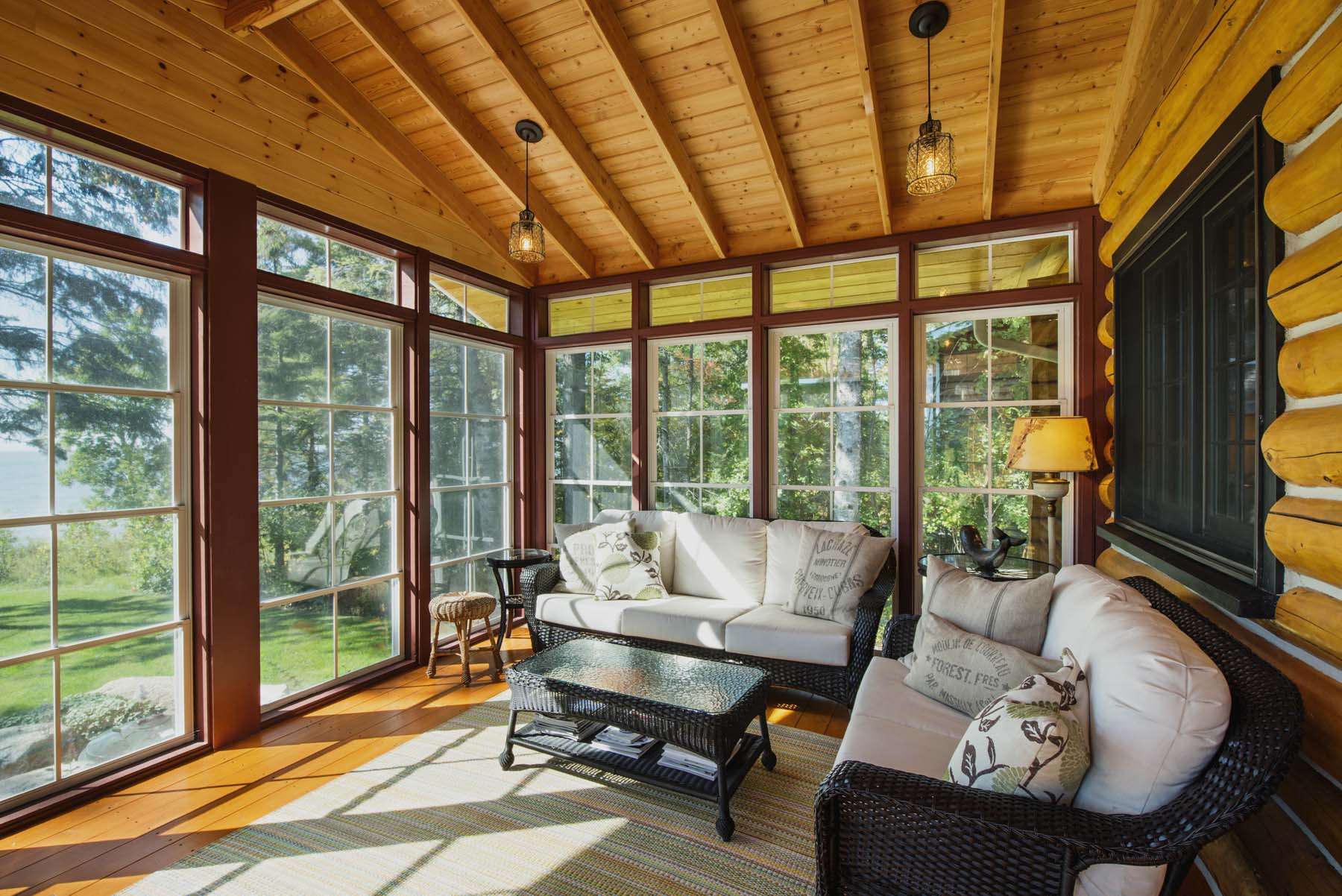 Se utilizan vigas de madera dura o encoladas. La madera se trata con agentes antisépticos que inhiben el desarrollo del hongo.La protección contra el fuego es proporcionada por antipiritas. Los módulos panorámicos utilizan madera protegida de la humedad y la deformación. Esto es crucial para extender la vida útil del producto. La viga pegada tiene excelentes propiedades: conserva su apariencia durante mucho tiempo, es resistente a la deformación, sirve casi tanto como el hierro. Sin embargo, las capas adhesivas tienen baja transpirabilidad. Sin embargo, la madera mejora las condiciones climáticas del edificio. Las ventanas de madera, entre otras cosas, son la mejor opción para la instalación en superficies inclinadas. Las propiedades de aislamiento térmico se mejoran debido al uso de gases inertes en ventanas de doble acristalamiento.