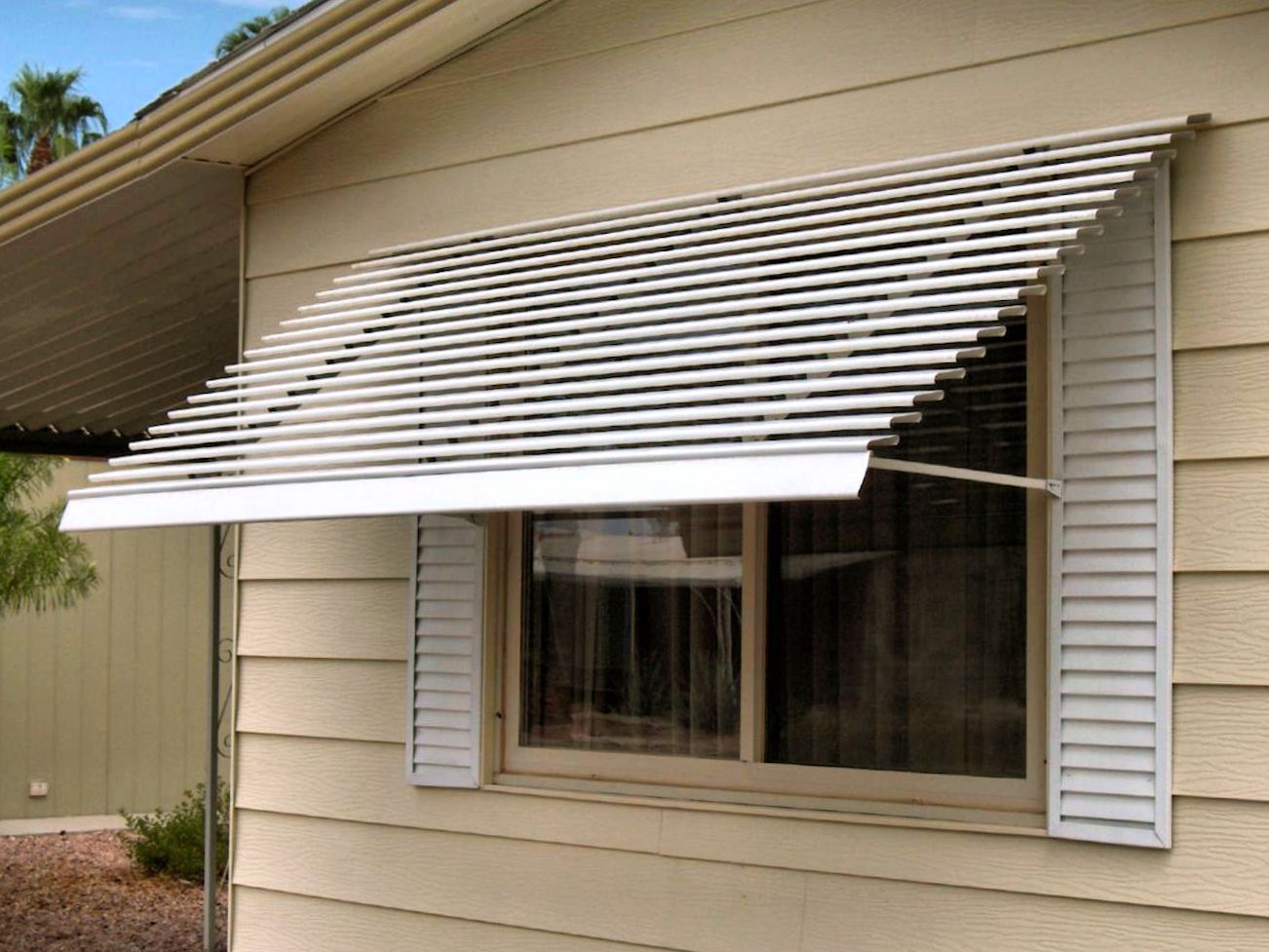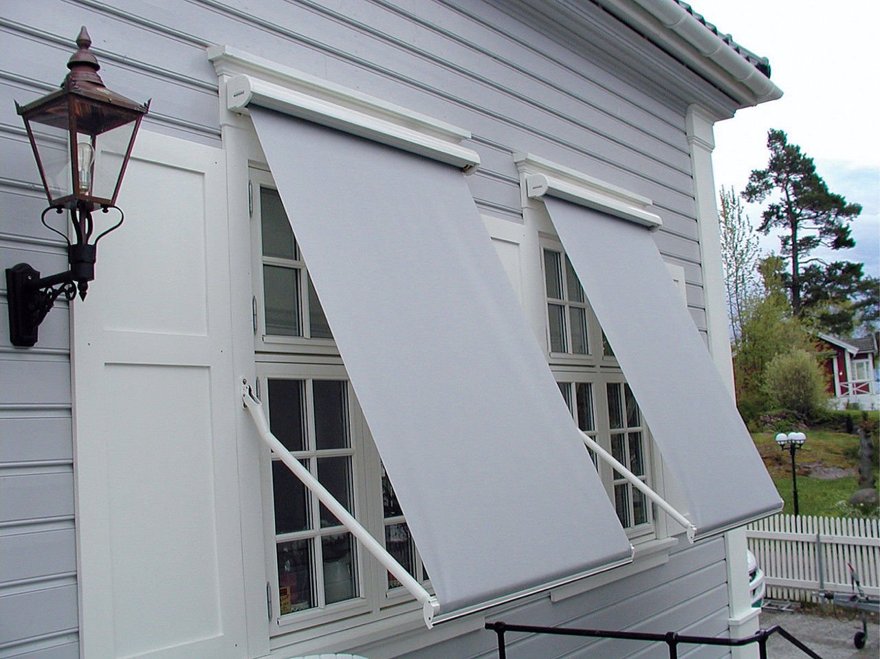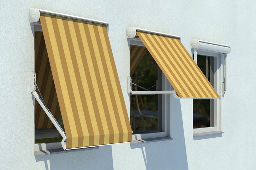 Al escalar, crean un dosel, que es su característica principal. Recientemente, la forma rectangular habitual ha ganado popularidad, casi en todo el Mediterráneo y en regiones similares en clima. El aumento de tamaño y la capacidad de ajustar la longitud convierten las sombrillas en un refugio completo contra el sol para un área del tamaño de un balcón grande. Las versiones más tradicionales de las cortinas suelen tener una forma y color decorativos. Hay aletas totalmente ascendentes y opciones plegables plegables. En ambos casos, la habitación permanece protegida del sol y, al mismo tiempo, se abre una vista de la calle. Las viseras de celosía más extendidas con montaje superior de hoja. En los días calurosos, el obturador se levanta y se fija en el puntal, y cuando baja la temperatura, la hoja se baja y se bloquea.