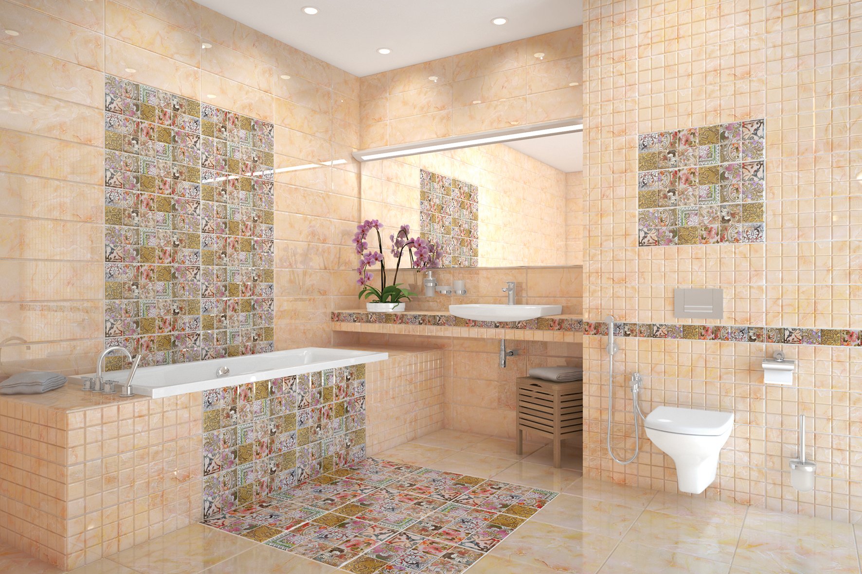 Además, en grandes salas, un panel compuesto de azulejos en forma de alfombra se verá muy colorido.