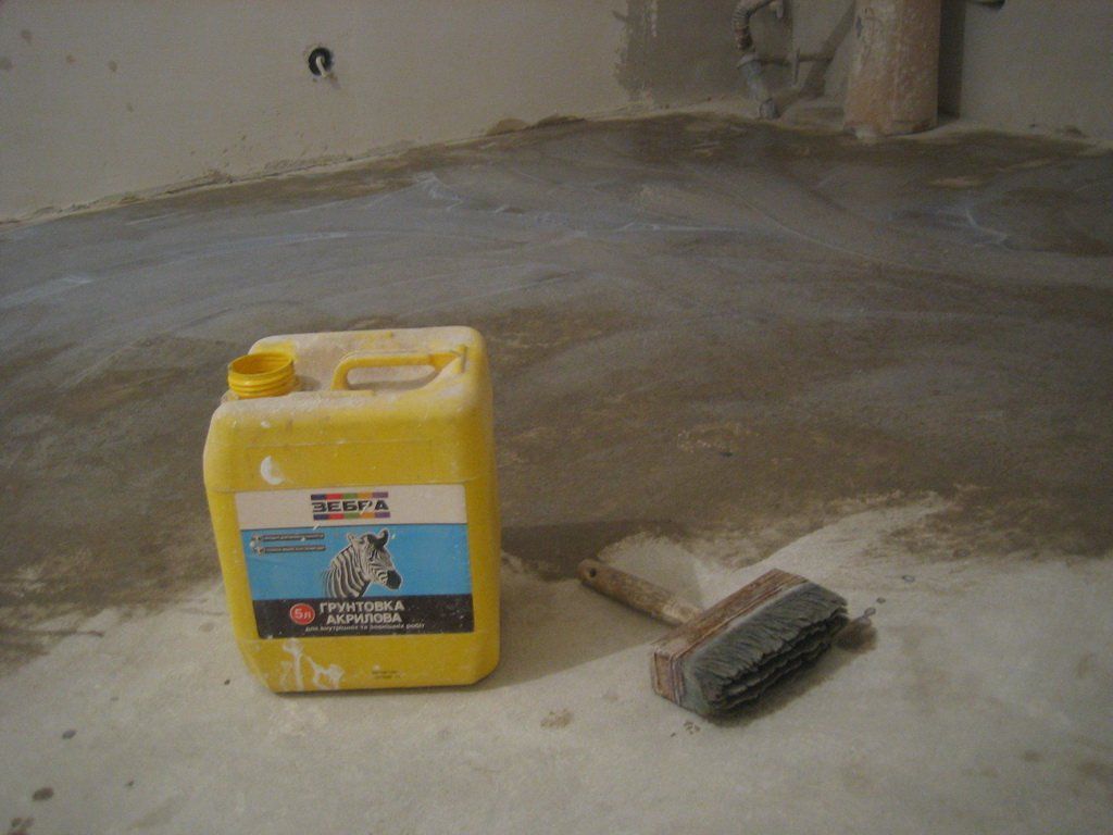 Cartilla La composición terminada se mezcla a fondo y se aplica al piso con una brocha y un rodillo. Después de 4 horas, puede continuar con los siguientes procedimientos preparatorios;
