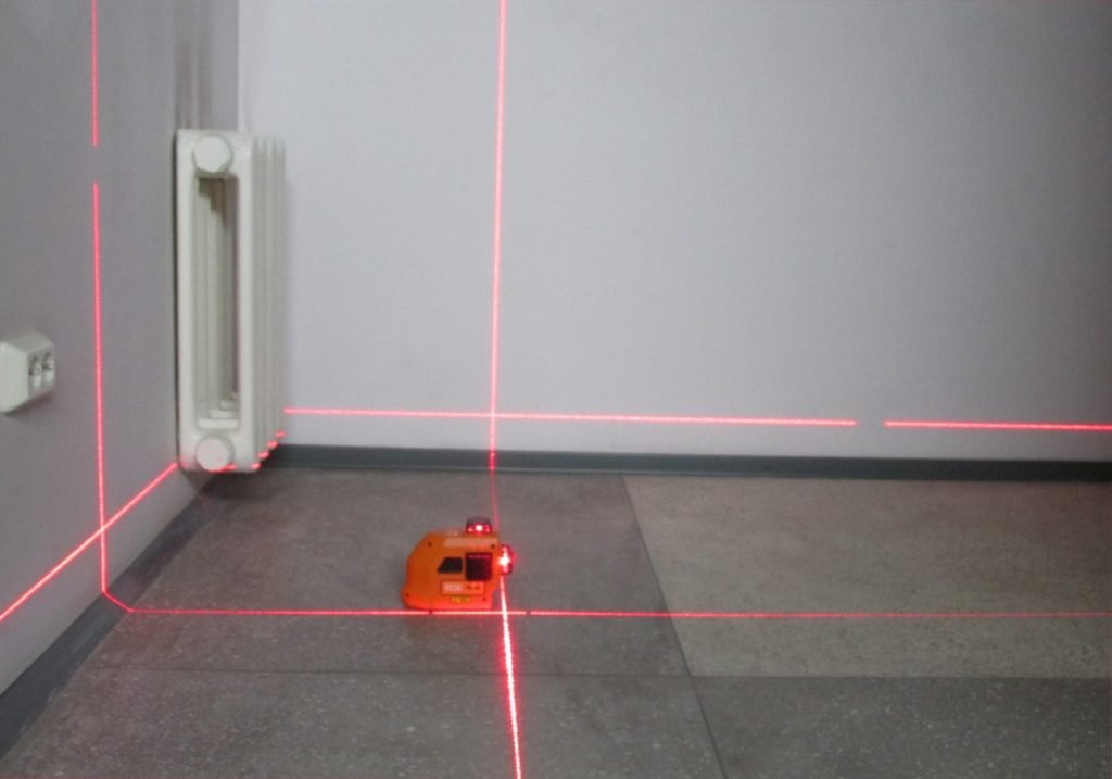 Usando el nivel láser.El dispositivo está montado en un trípode en el medio de la habitación. La viga se dirige alternativamente a las paredes y a las esquinas, tome notas con un lápiz.