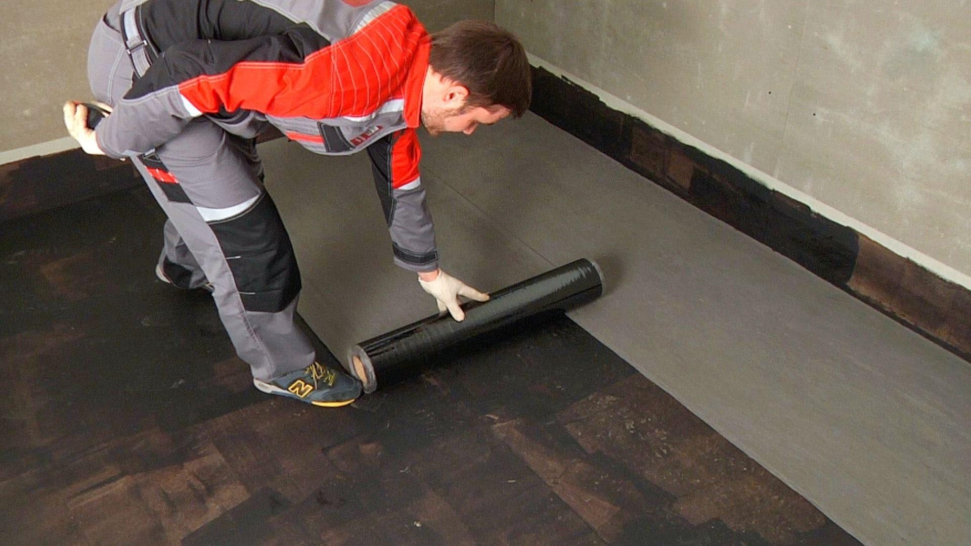 Antes de colocar material repelente al agua, se eliminan las astillas y grietas, los baches se limpian con mortero de cemento. Ahora la superficie se trata con emulsión de betún, compuestos penetrantes. Los materiales enrollados se enrollan en el piso con una aproximación a las paredes y entre sí de 15 cm. Después de que el recipiente esté completamente preparado para la regla, se corta el material restante.