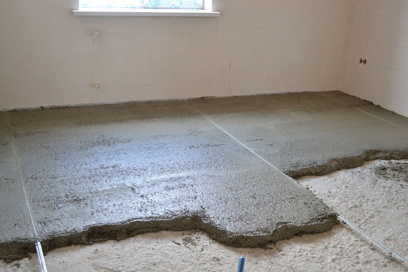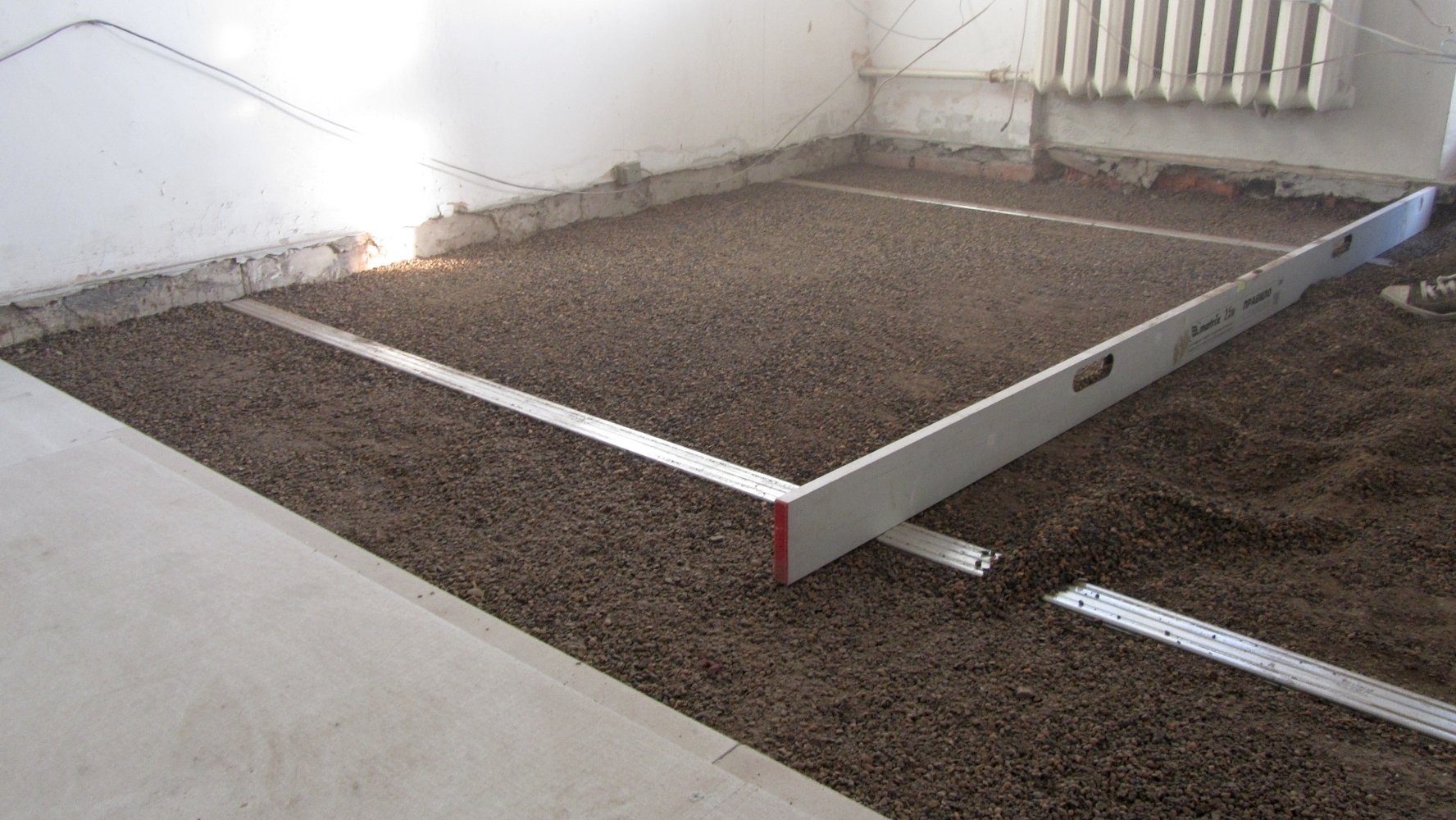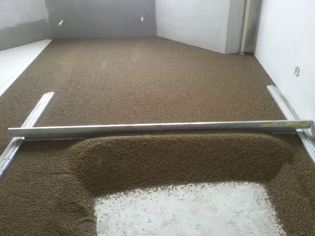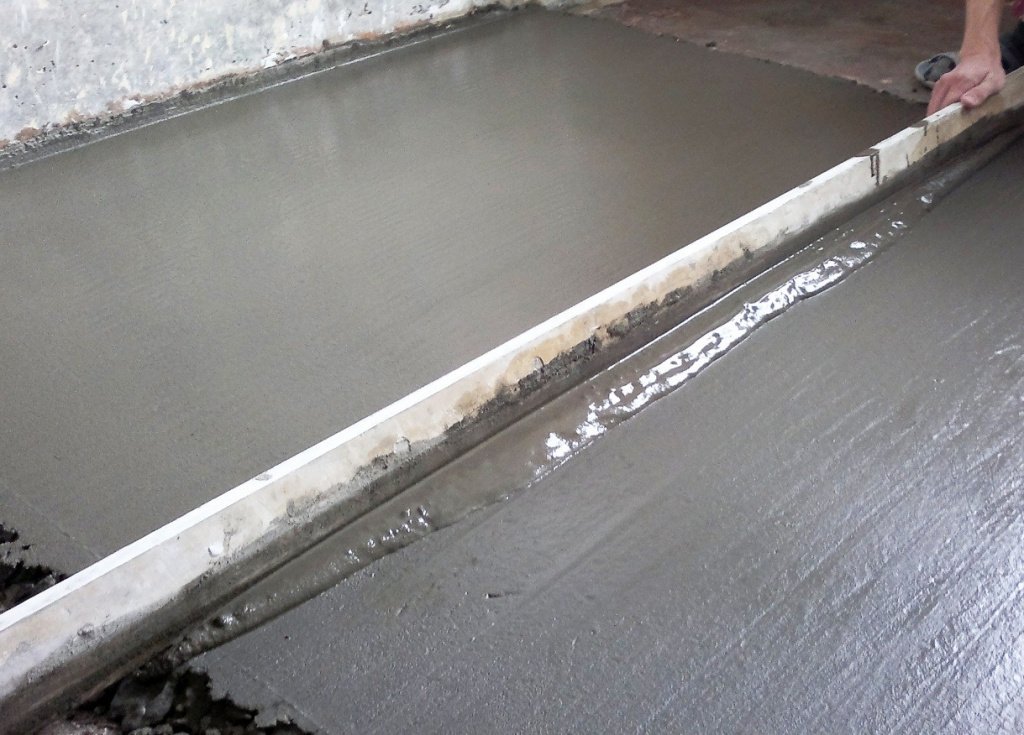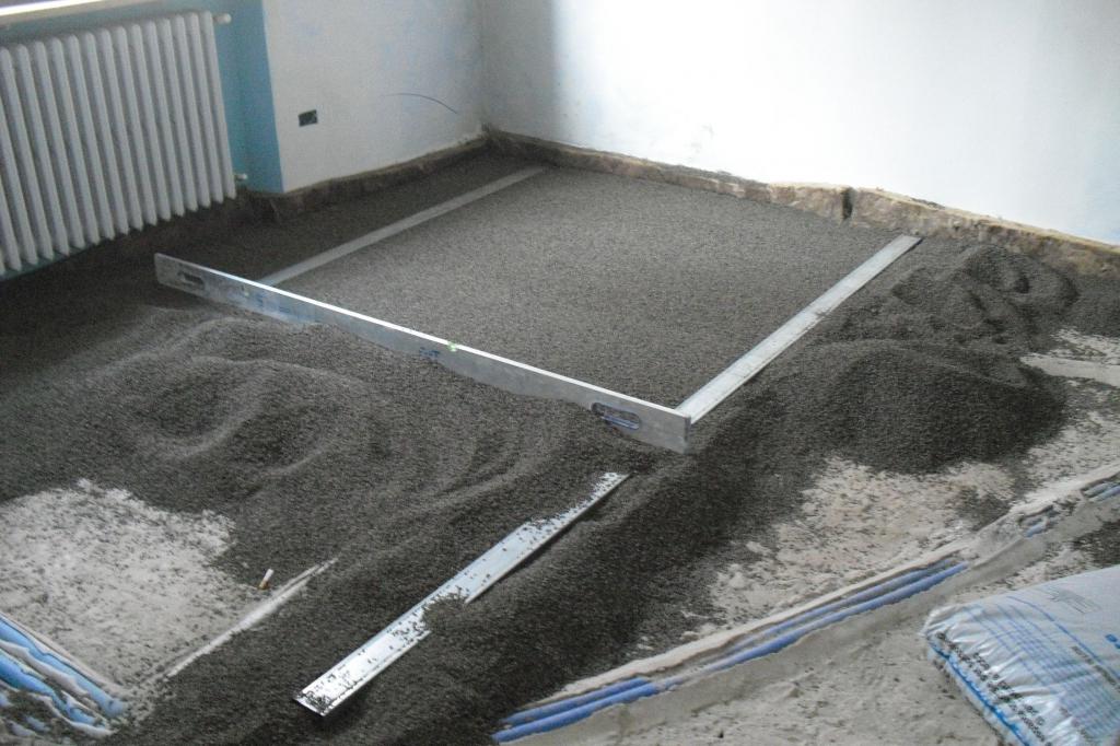 Antes de trasladar la solución al piso, es necesario dibujar o fotografiar las comunicaciones que pasan, de modo que si es necesario repararlas, se puedan encontrar rápidamente. El llenado comienza desde la esquina opuesta a la salida de la habitación. La solución se vierte entre dos balizas y se nivela utilizando la regla en movimientos en zigzag. El exceso se elimina en un cubo, la mezcla se agrega a los lugares de los huecos.