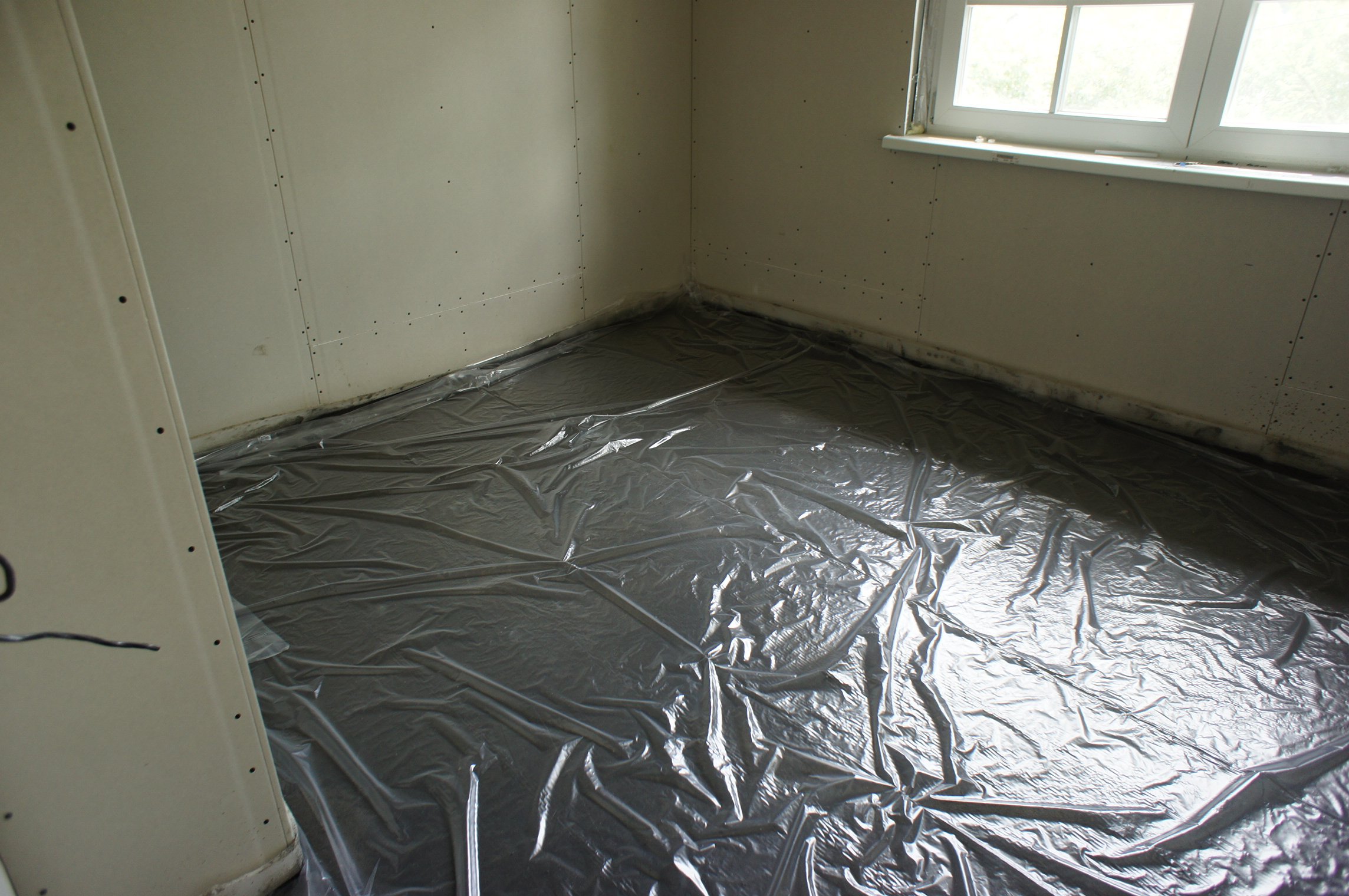 Colocación de material aislante. Más a menudo use una película de plástico simple. Se endereza una sola pieza sobre toda el área con un acercamiento a las paredes de al menos 20 cm;