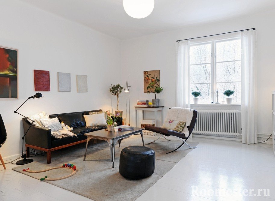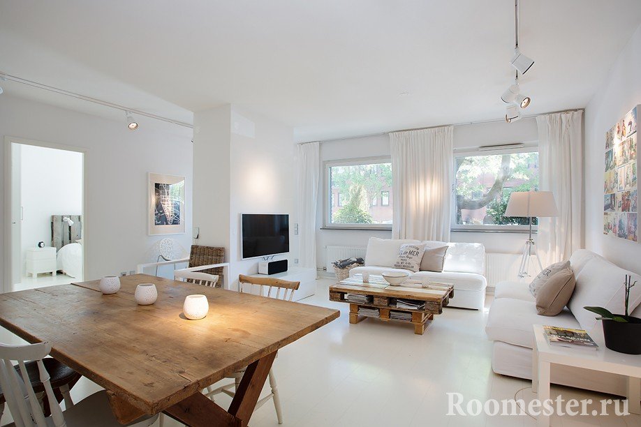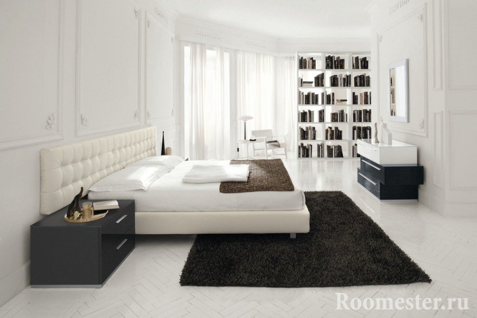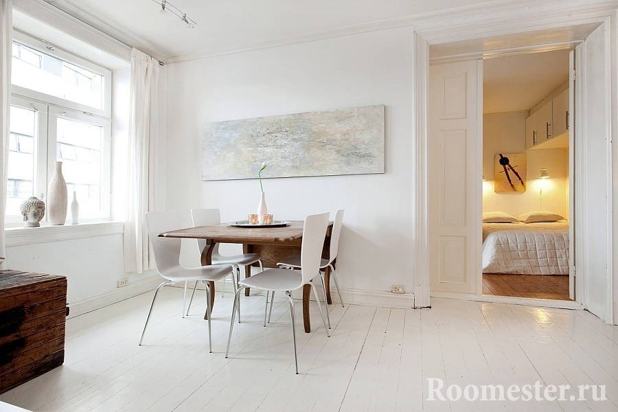 Exceso de color blanco, repetimos, en lugar de sentir pureza y tranquilidad, traerá una sensación de frío, desapego. Es necesario "diluir" el piso de luz con elementos adicionales, detalles de un esquema de color diferente. La combinación de un piso oscuro con paredes claras se verá más armoniosa.