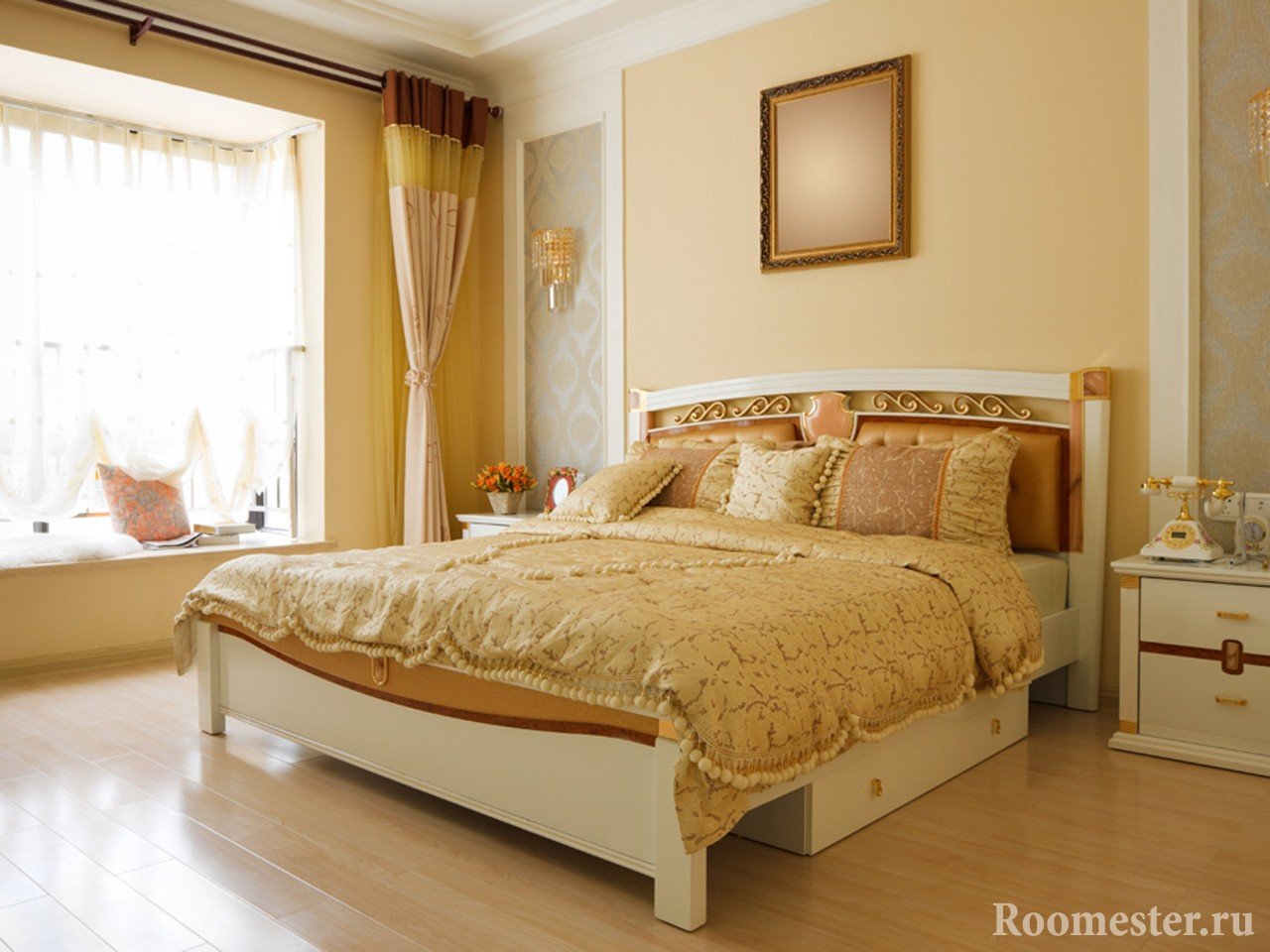Para que la habitación parezca más cálida, el piso claro debe complementarse con paredes de colores pastel oscuros.Arena, ciruela, caramelo, color chocolate son perfectos. Los pisos oscuros no son la mejor opción para el espacio del dormitorio.