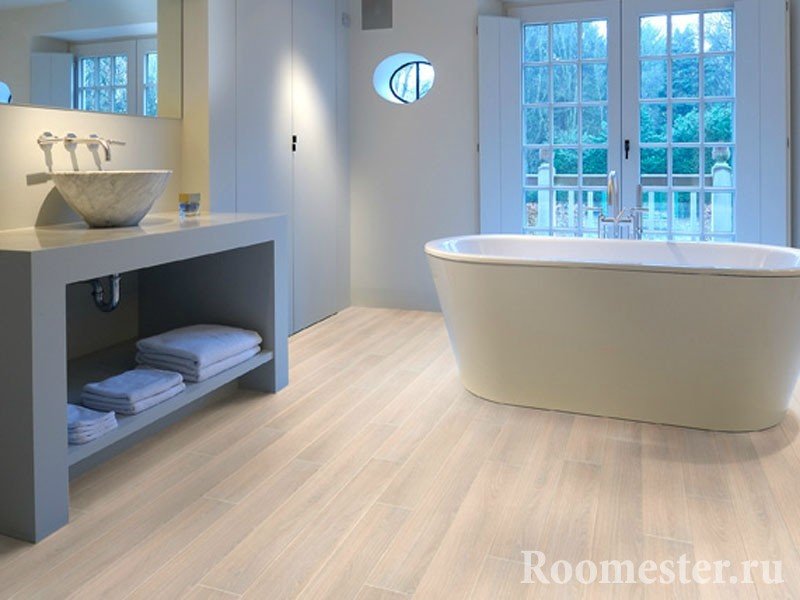Un piso de color claro no solo puede expandir la habitación visualmente, sino que también agrega una sensación de limpieza. El piso oscuro es significativamente inferior a las características del piso en blanco. El color del piso debe ocultar los rastros de gotas de agua, manchas.