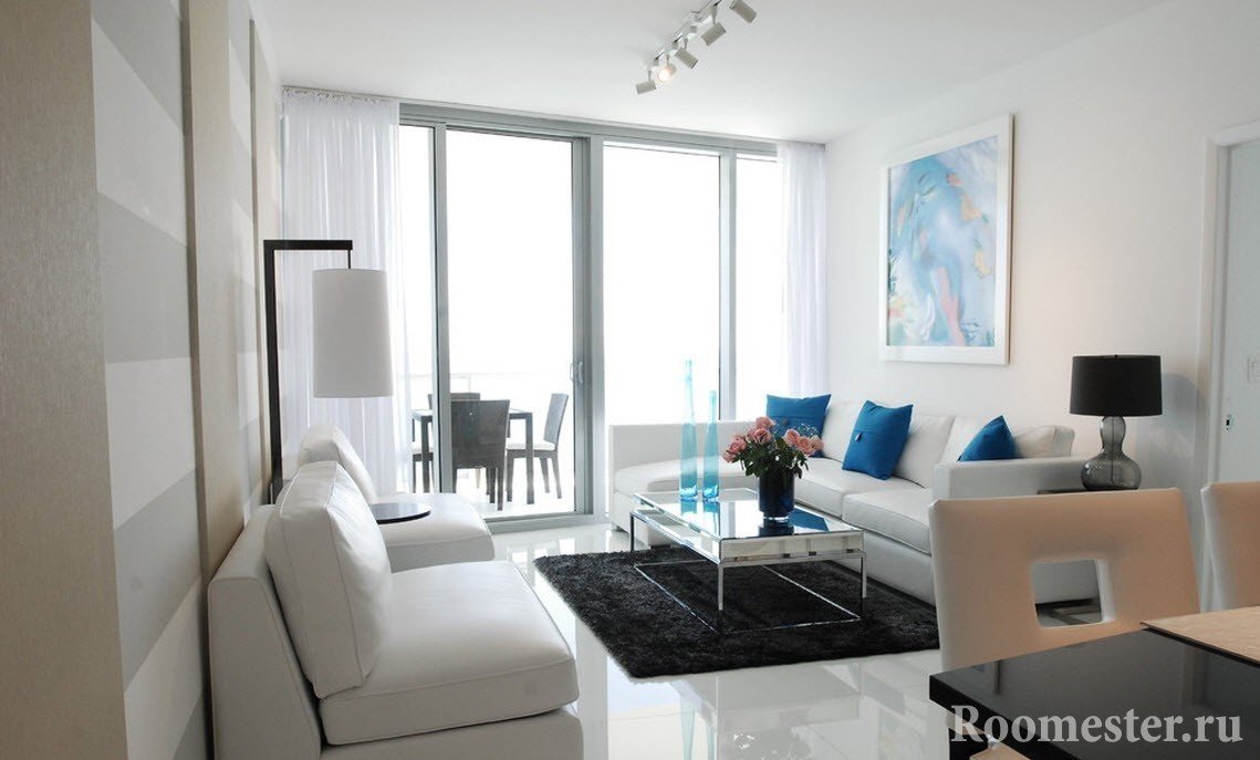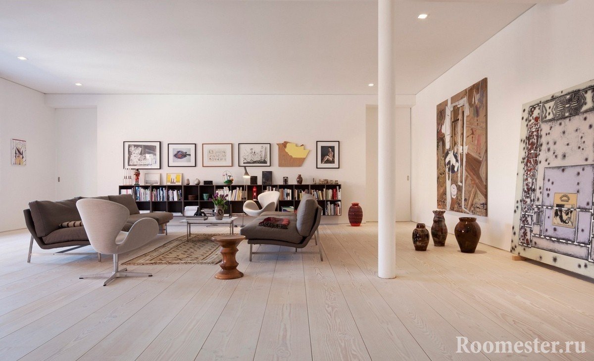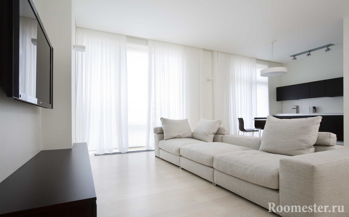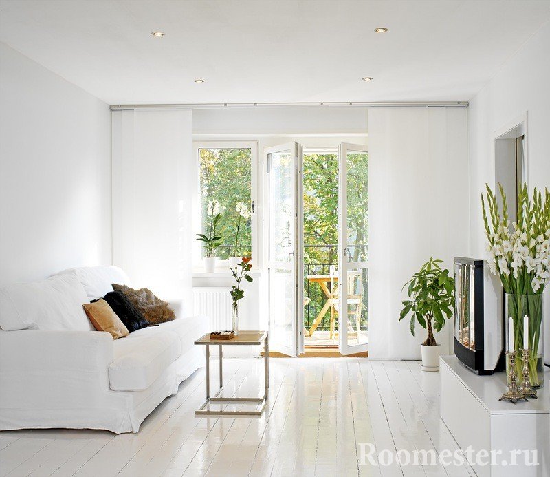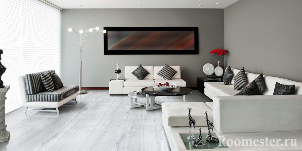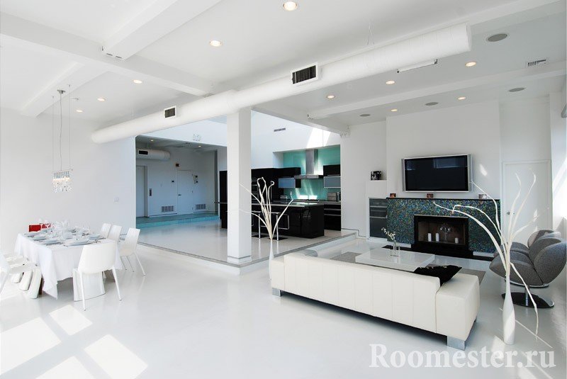 Al diseñar una sala de estar sobre la base de un piso de sombra blanca, es posible lograr una expansión del espacio, un aumento visual en el área. Para hacer esto, las paredes también dejan una sombra ligera. Si va demasiado lejos con el blanco, puede convertir una habitación acogedora y cómoda en una fría y distante.