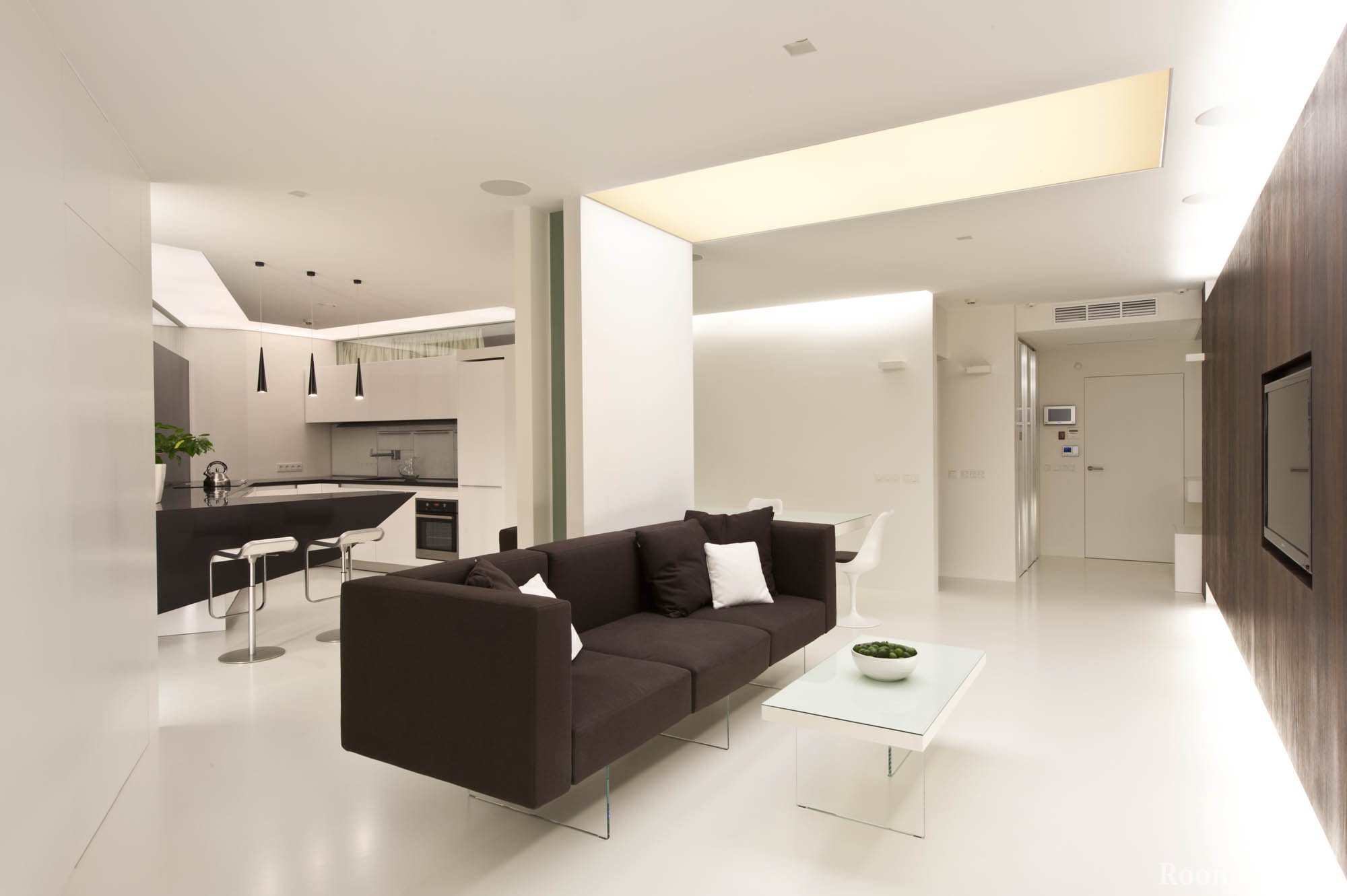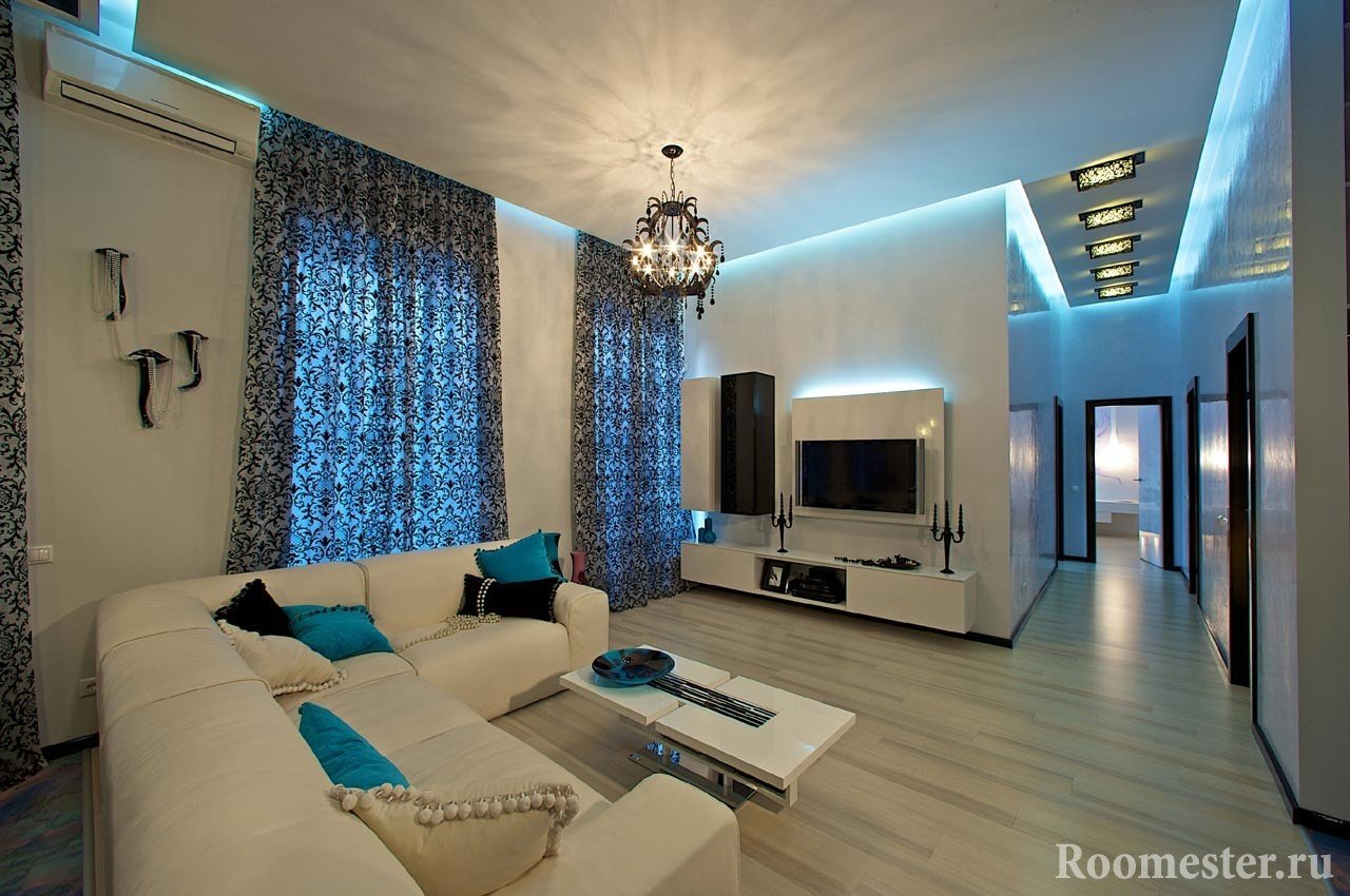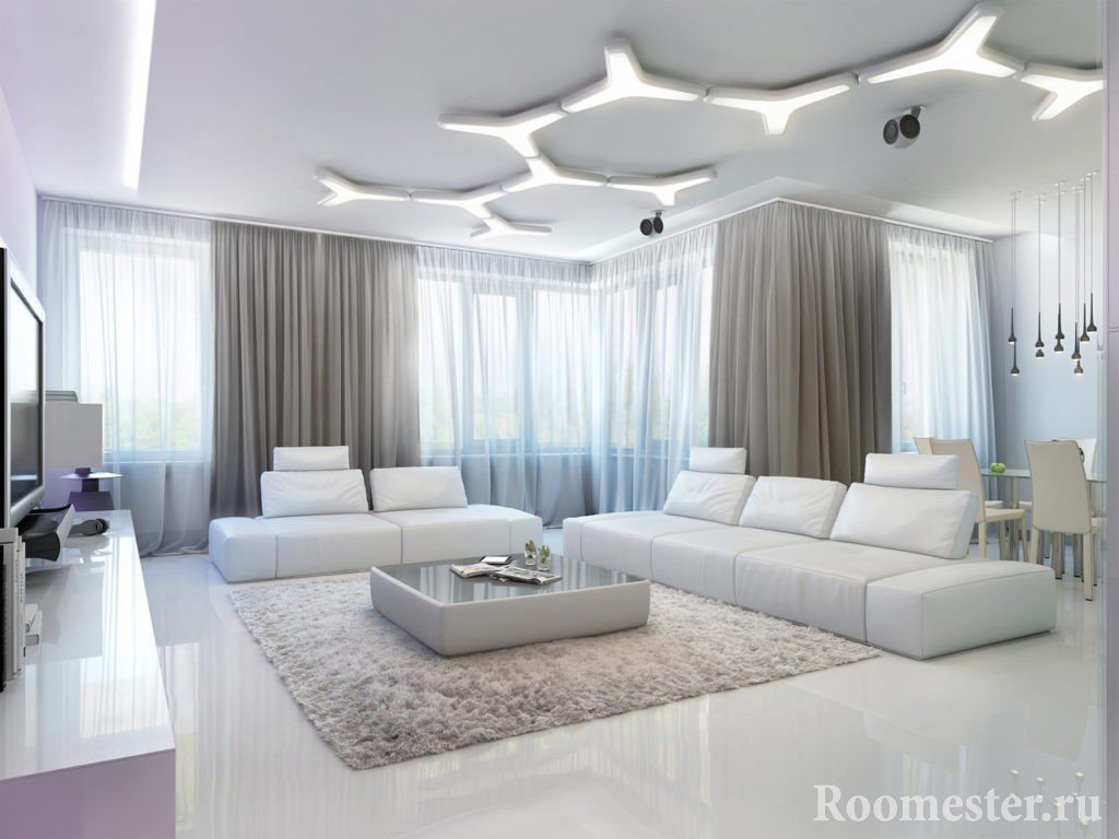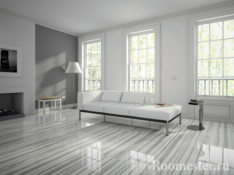 Al diseñar una sala de estar sobre la base de un piso de sombra blanca, es posible lograr una expansión del espacio, un aumento visual en el área. Para hacer esto, las paredes también dejan una sombra ligera. Si va demasiado lejos con el blanco, puede convertir una habitación acogedora y cómoda en una fría y distante.