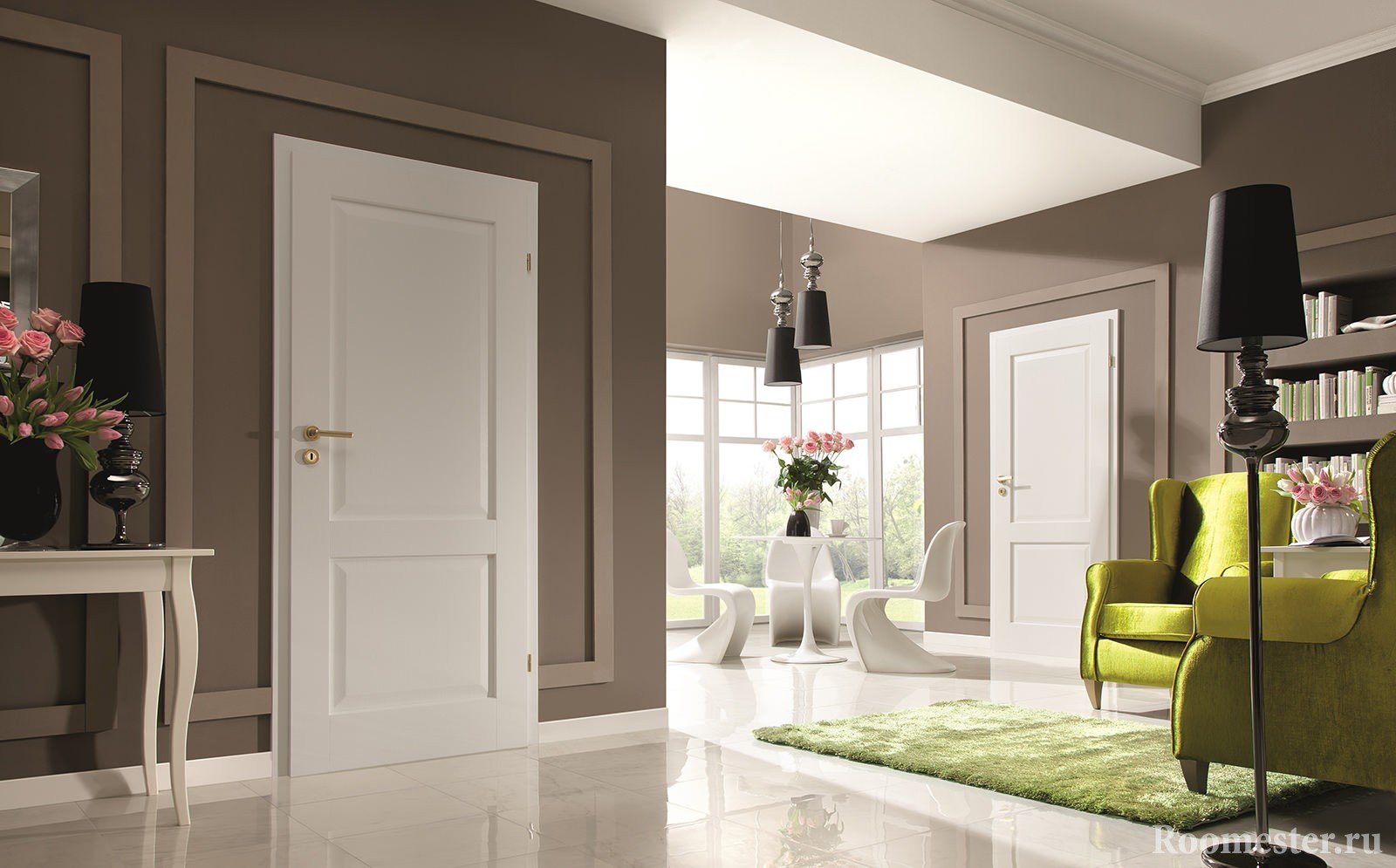 Si hay dos puertas ubicadas una al lado de la otra en la habitación, entonces deben ser del mismo color, mientras que las puertas ligeras pueden perderse contra un piso y paredes claras.Si estas puertas ocultan el baño y el baño, entonces este es exactamente el efecto que se necesita.