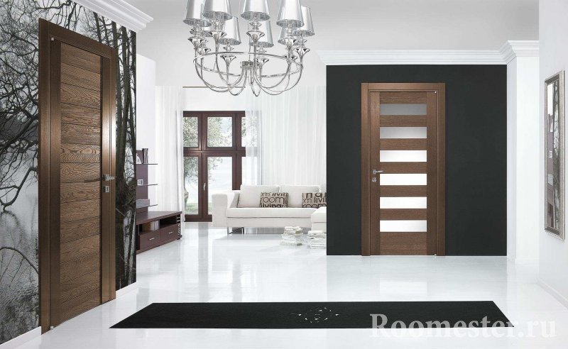 Las puertas oscuras contra un piso claro pueden agregar espacio visible. Para habitaciones con un área de 2 * 3 m2, las puertas oscuras se convertirán en un diseño voluminoso absurdo.