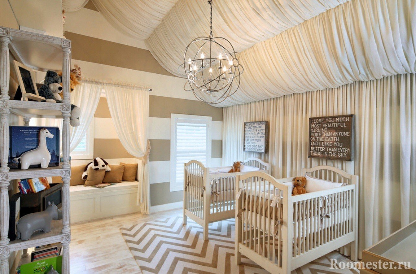 Si utiliza un tipo de montaje de tableta, es fácil lograr el efecto de una tienda de campaña. Para mejorar la ligereza de la superficie ondulada, se recomienda usar variedades translúcidas de tela. Si la cortina se realiza con pegamento, entonces este efecto no se puede lograr. Dado que el material se pegará como papel tapiz clásico, sin marco ni perfiles. Las inserciones de tela se verán interesantes.