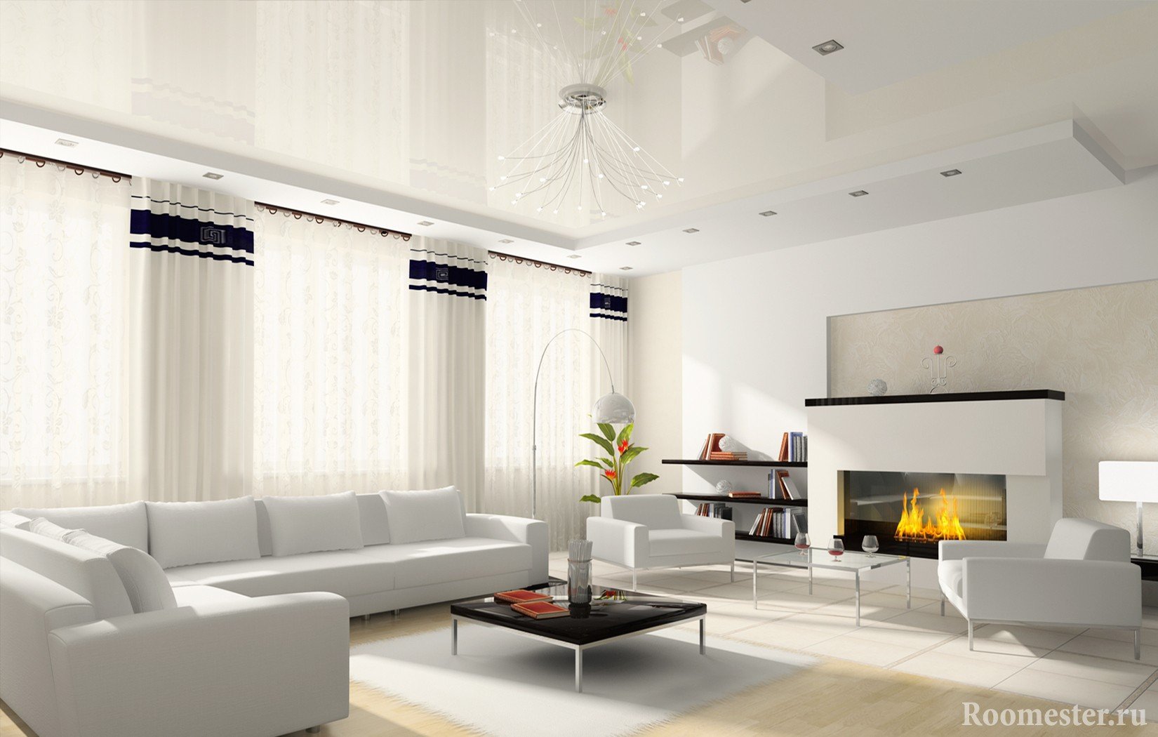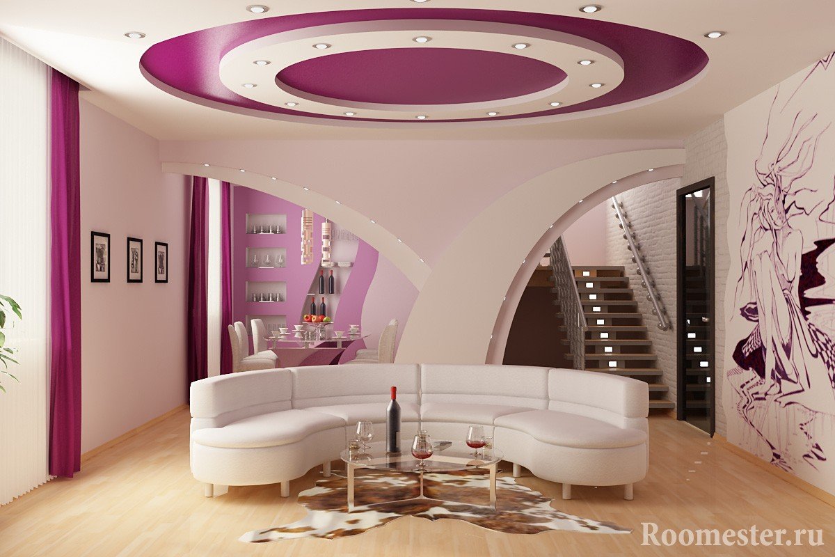 Si los dibujos se ven geniales en la guardería, entonces en otras habitaciones puedes prescindir de imágenes. Deje un techo mate perfectamente plano. Sin embargo, el lienzo ascético blanco de muchos no satisface su simplicidad. El alma de los propietarios requiere colores inusuales de techos tensados con focos u otros tipos de decoración.