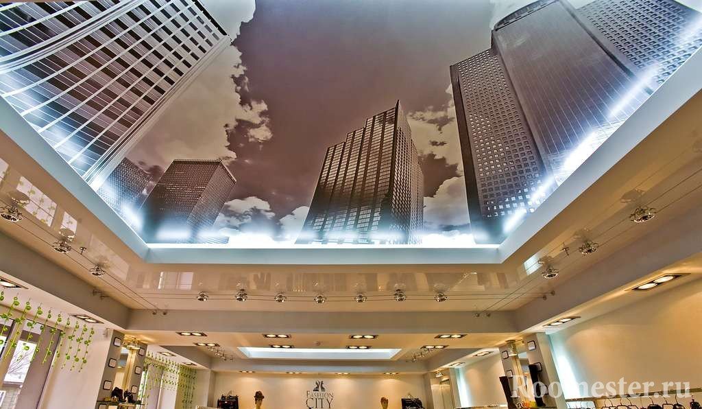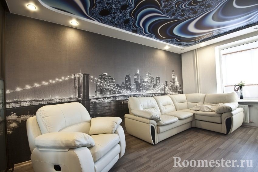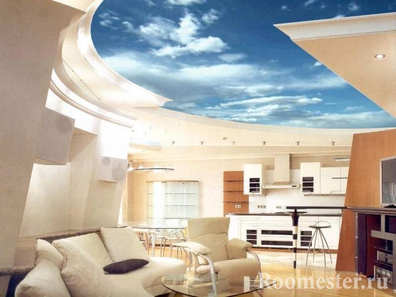 La gama de esta variedad de decoración está limitada solo por la imaginación. Los lienzos brillantes son fáciles de instalar y de calidad de impresión. Siempre puedes decorar adicionalmente con una imagen personalizada. Las inserciones de fotos personales en parcelas animadas se ven originales. Esta decoración de techo es ideal para niños. El niño puede tener derecho a elegir sus personajes favoritos.
