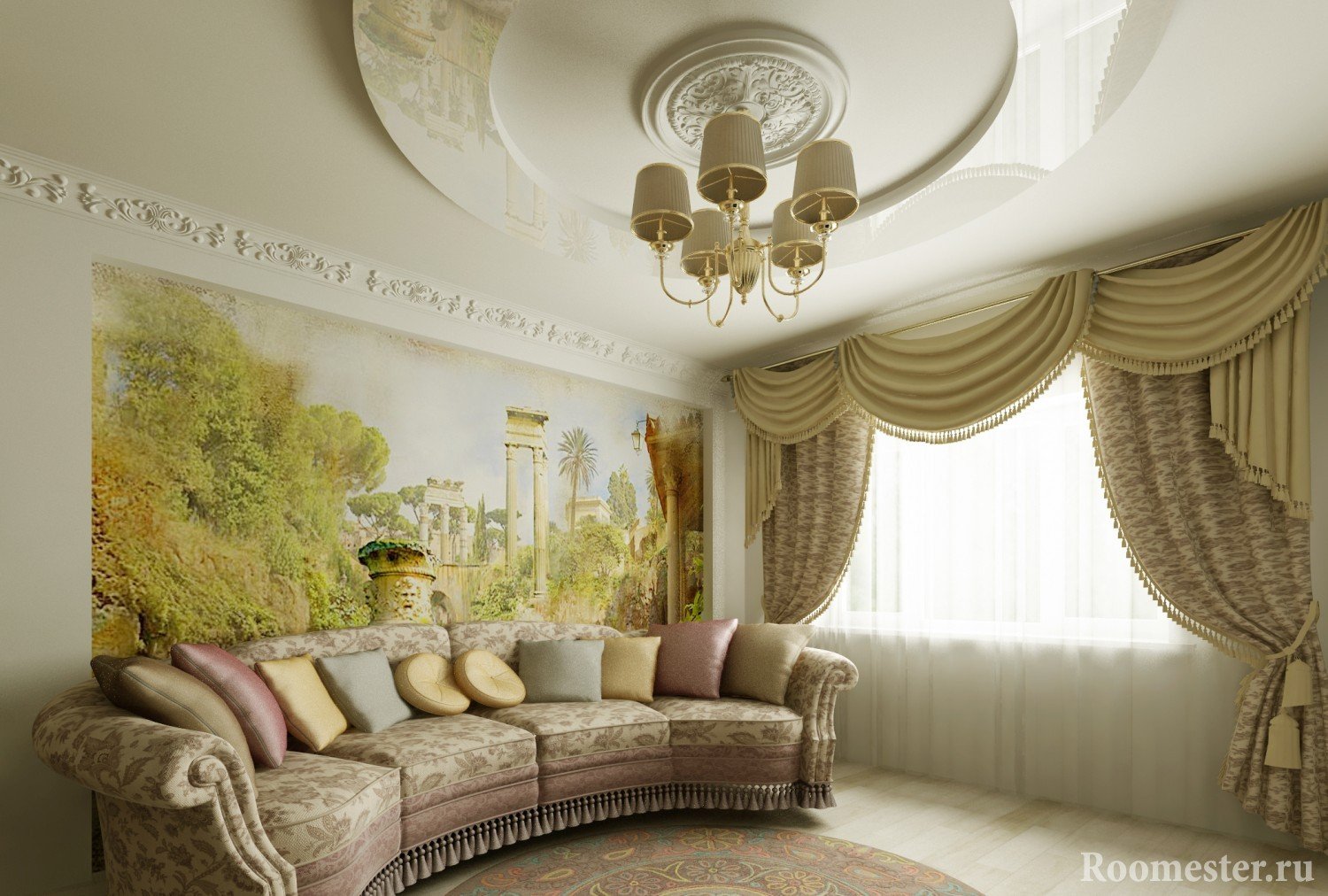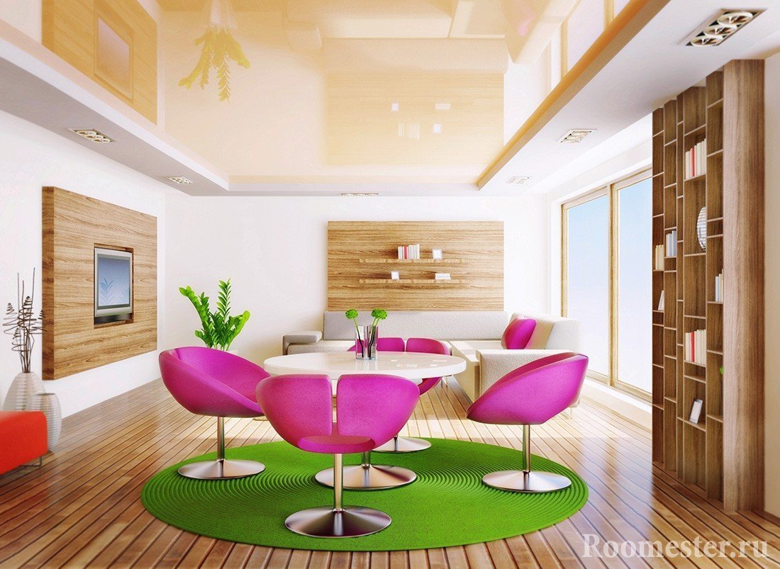 La decoración a través de tela ecológica es capaz de decorar cualquier plano de la casa. El material seguro se caracteriza por la más amplia variedad y excelentes propiedades operativas. Combate perfectamente el moho, es fácil de limpiar y no se deforma con el tiempo. La decoración del techo con un paño cambia las dimensiones visibles de la habitación.
