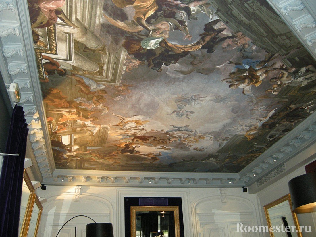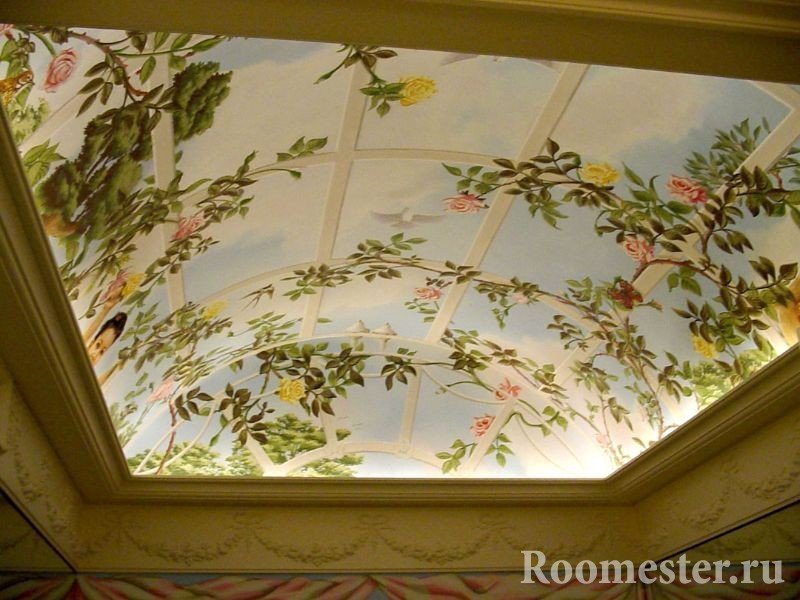El tipo de decoración original de recuerdo es aplicable al plano superior de la casa. No requiere una superficie perfectamente plana si se planea lograr el efecto de antigüedad o desgaste. Para decorar cualquier otra imagen, se requerirá alineación y lechada. Los dibujos modernos están impresos en una impresora y recubiertos con barniz acrílico. Luego poner en el techo. Para lograr la suavidad, debe recoger un rodillo especial. Si los propietarios se detienen en los viejos tiempos, entonces el pegado puede ser limitado. Después del secado, la capa superior se retira con cuidado. Está empapado con una pistola rociadora para separarlo del acabado. Cuando el dibujo se seca, se recomienda aplicar otra capa de barniz decorativo.