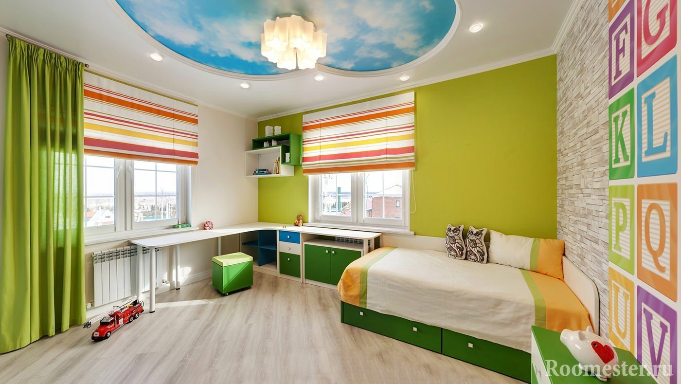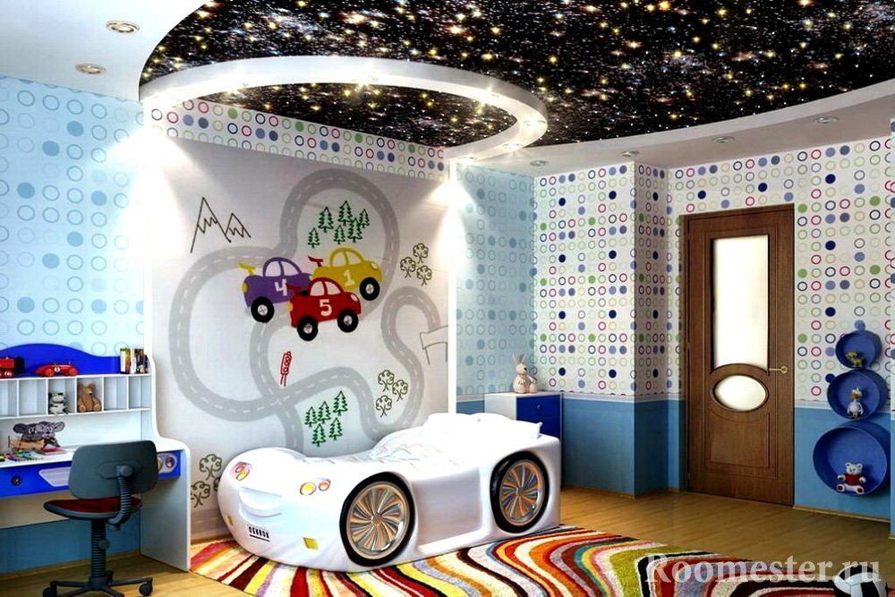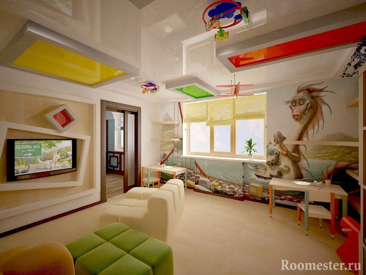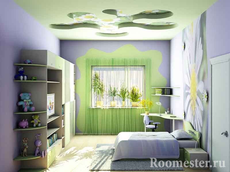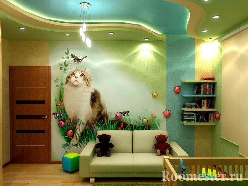 La facilidad de trabajar con el material inspira la imaginación humana. La implementación de las ideas más inesperadas se debe a su excelente rendimiento. Toma cualquier forma y proporción. Produce bien la iluminación, lo cual es importante para la guardería. El material práctico no requiere cuidados especiales y cubre todos los defectos de la superficie. Si lo desea, puede crear una estructura multicapa según el principio del paso. Los paneles de yeso insonorizados se montan en un marco instalado hecho de vigas de madera y perfiles metálicos. Luego se complementa con un tejido adecuado y luces incorporadas. Después de la masilla y la pintura, la iluminación puntual crea un diseño exclusivo. Placer estético garantizado.