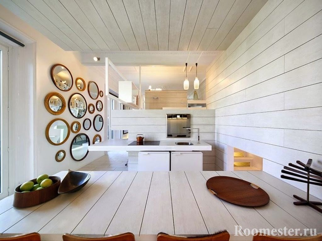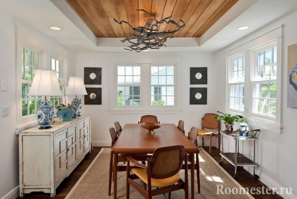 Para crear un estilo étnico, a menudo se usa la decoración de bambú.El tallo de la planta ascética y misteriosa se instala fácilmente en el plano mediante un aglutinante adhesivo. Para hacer esto, los módulos de mimbre se cortan previamente por la mitad y se fijan de forma segura. En el mercado puede encontrar combinaciones ya preparadas de cualquier tamaño. Los enrejados se construyen fácilmente con hilo común. Se ven interesantes con la textura de varias etapas del techo de pladur. La decoración oriental es intrigante.