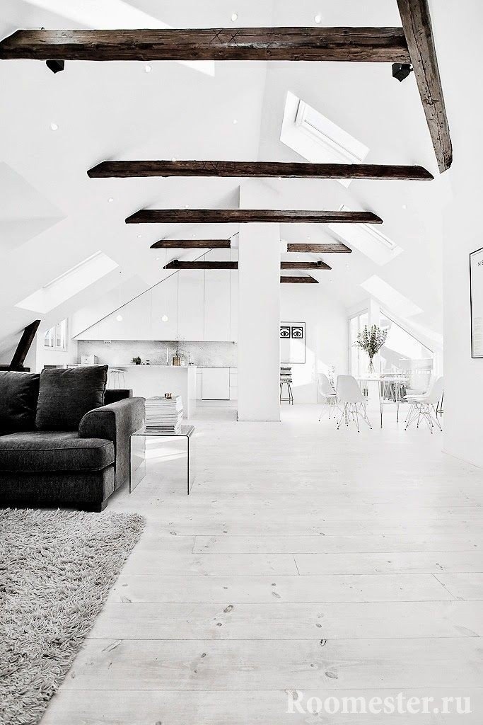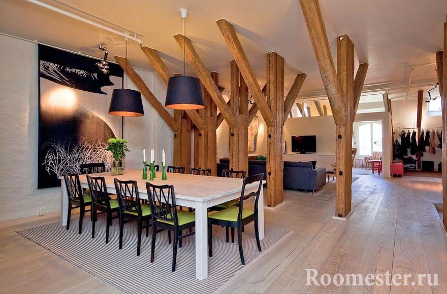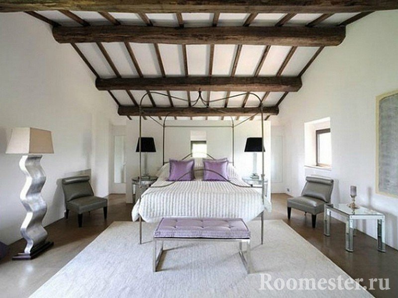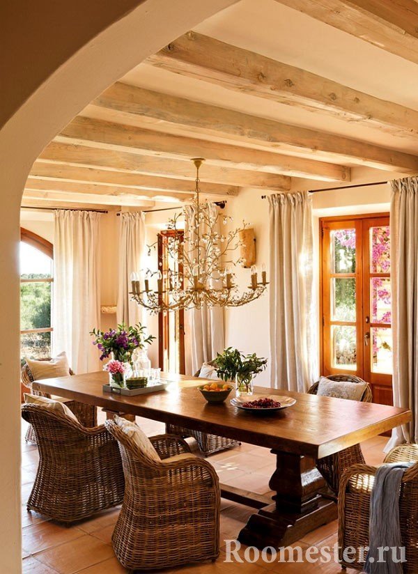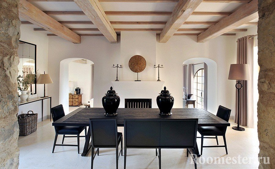 También es necesario verificar la comparabilidad del estilo elegido con las estructuras del techo. Es improbable que el bombardeo barroco se mezcle bien con estos objetos masivos. La superposición brutal tampoco es adecuada para rococó, donde la atmósfera de pathos requiere diferentes tipos de acabados. Las vigas gravitan más hacia interiores austeros, elegantes e incluso valientes. Donde, sobre todo, se valora la naturalidad y el tono natural del material, y la pompa es completamente inútil.