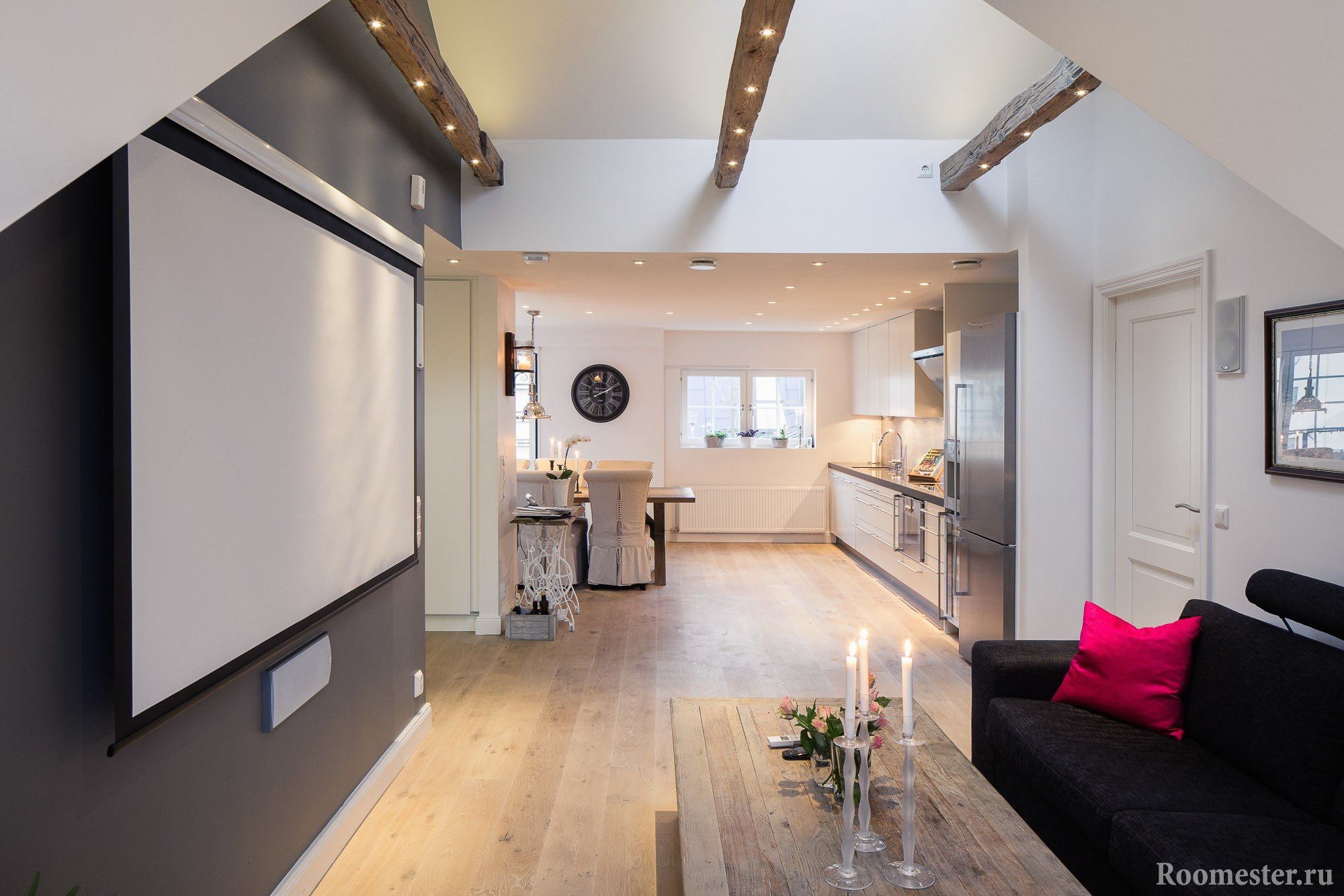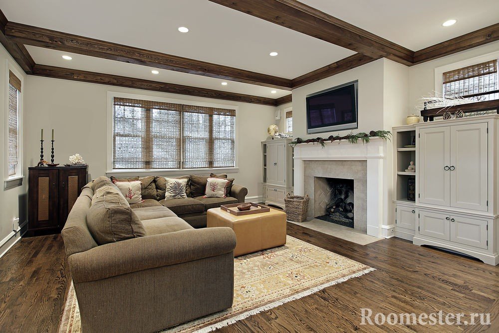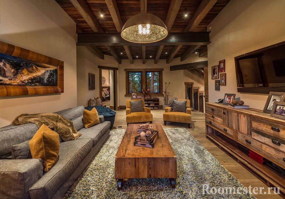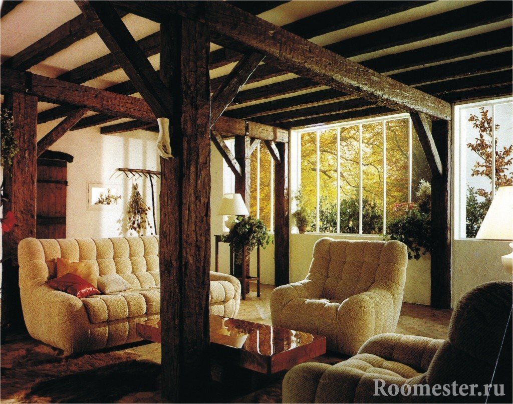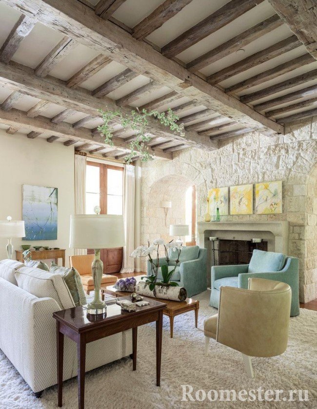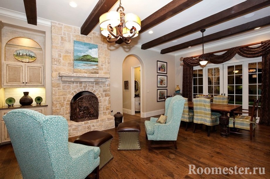 Una de las mejores opciones para estos fines. A los diseñadores les encanta enfatizar el rico interior con vigas decorativas en el techo. Esto resalta muebles lujosos y pisos de madera de madera natural.