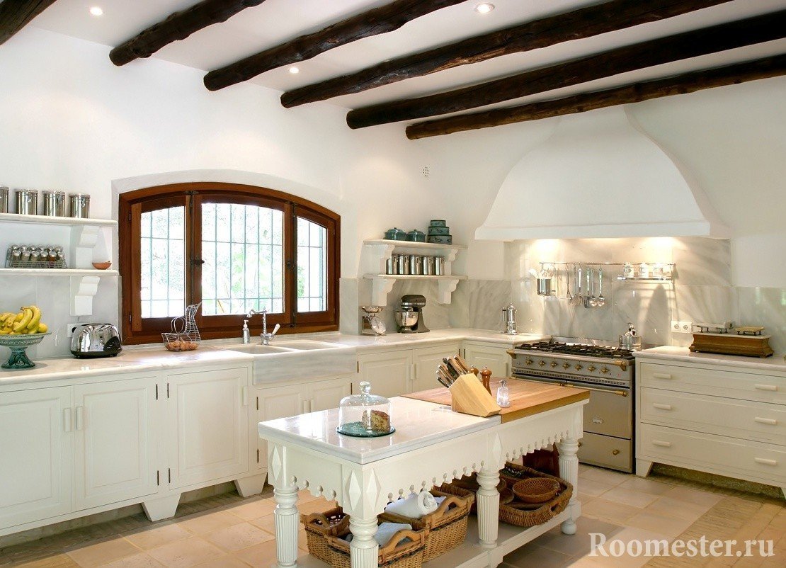 El estilo francés combina perfectamente con vigas decorativas encaladas. Según el presupuesto, se utiliza madera natural o vigas falsas. Estos últimos son fáciles de instalar con sus propias manos, ya que la instalación no requiere habilidades especiales.