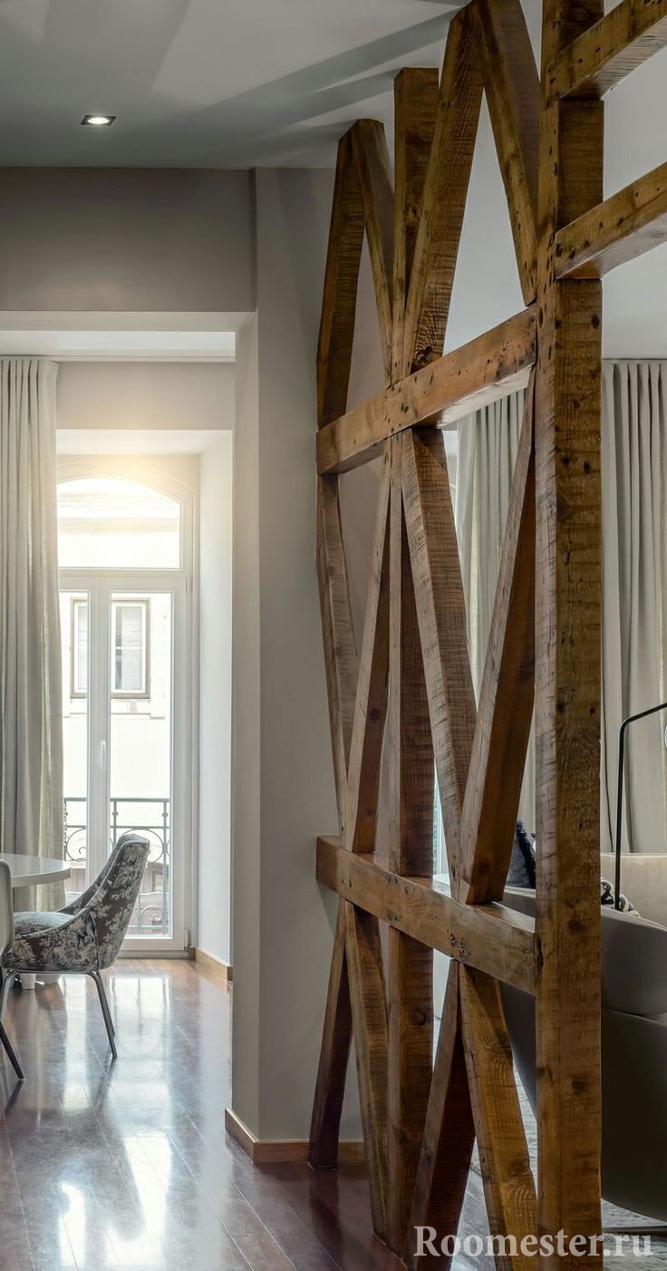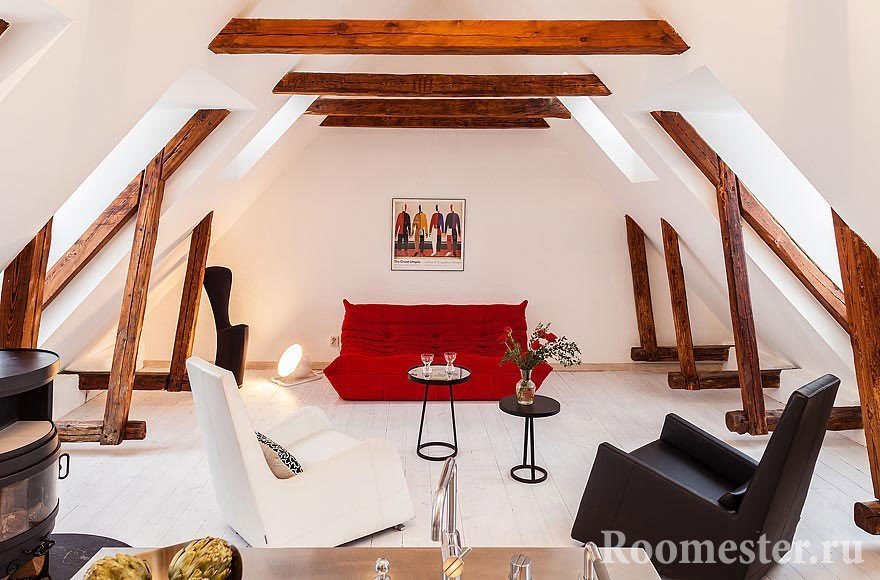 Su presencia en hogares privados está implícita a priori, ya que las estructuras son un elemento integral del techo. En este caso, el propietario puede dejar el piso en su forma natural y puede ocultarlo con una partición de cartón yeso. Todo depende del estilo de habitación elegido. El uso de estructuras de techo puede hacerse apropiado mediante un proyecto de diseño individual, donde se combinará un estilo estricto con los objetivos prácticos de zonificar la habitación.