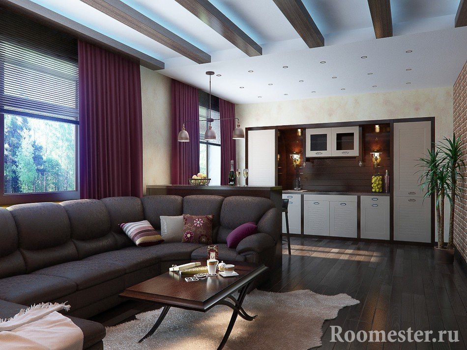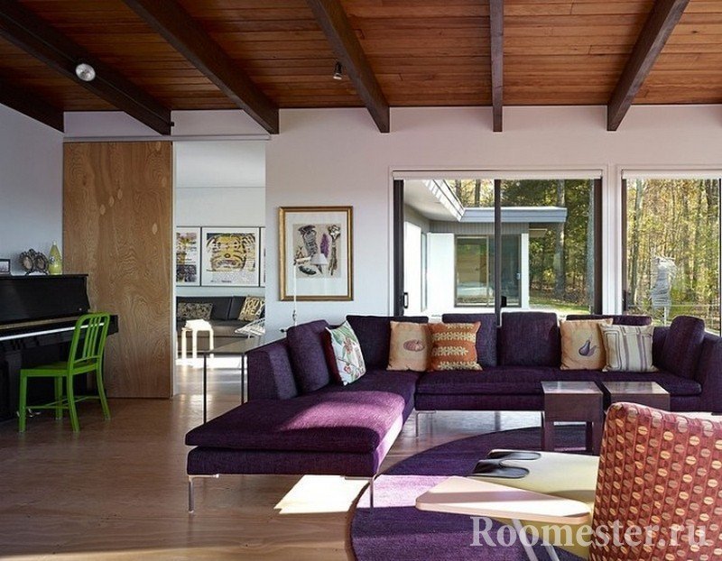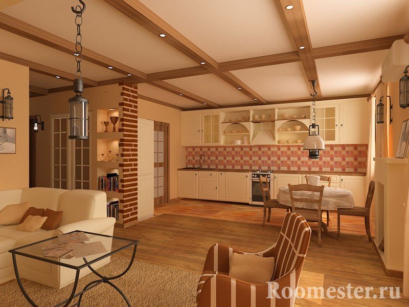 Más opción de presupuesto, ya que permite el uso gratuito de productos artificiales. Las vigas del techo en el interior están hechas en un color tan brillante que la madera natural no tiene. Luego, se instala la iluminación de zona para distinguir entre áreas funcionales. Su número se deja a los propietarios.