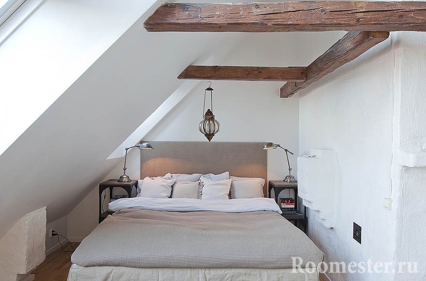 La decoración de las habitaciones en los áticos parece bastante pretenciosa. En este caso, incluso la superficie irregular del techo estará justificada;