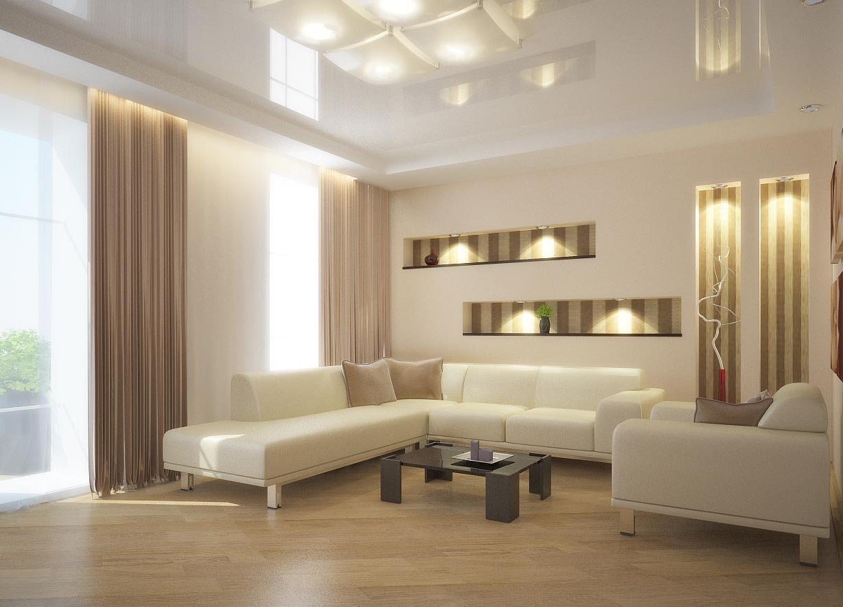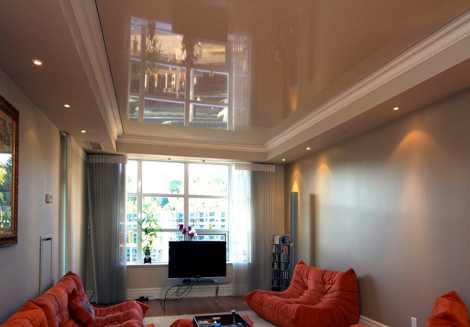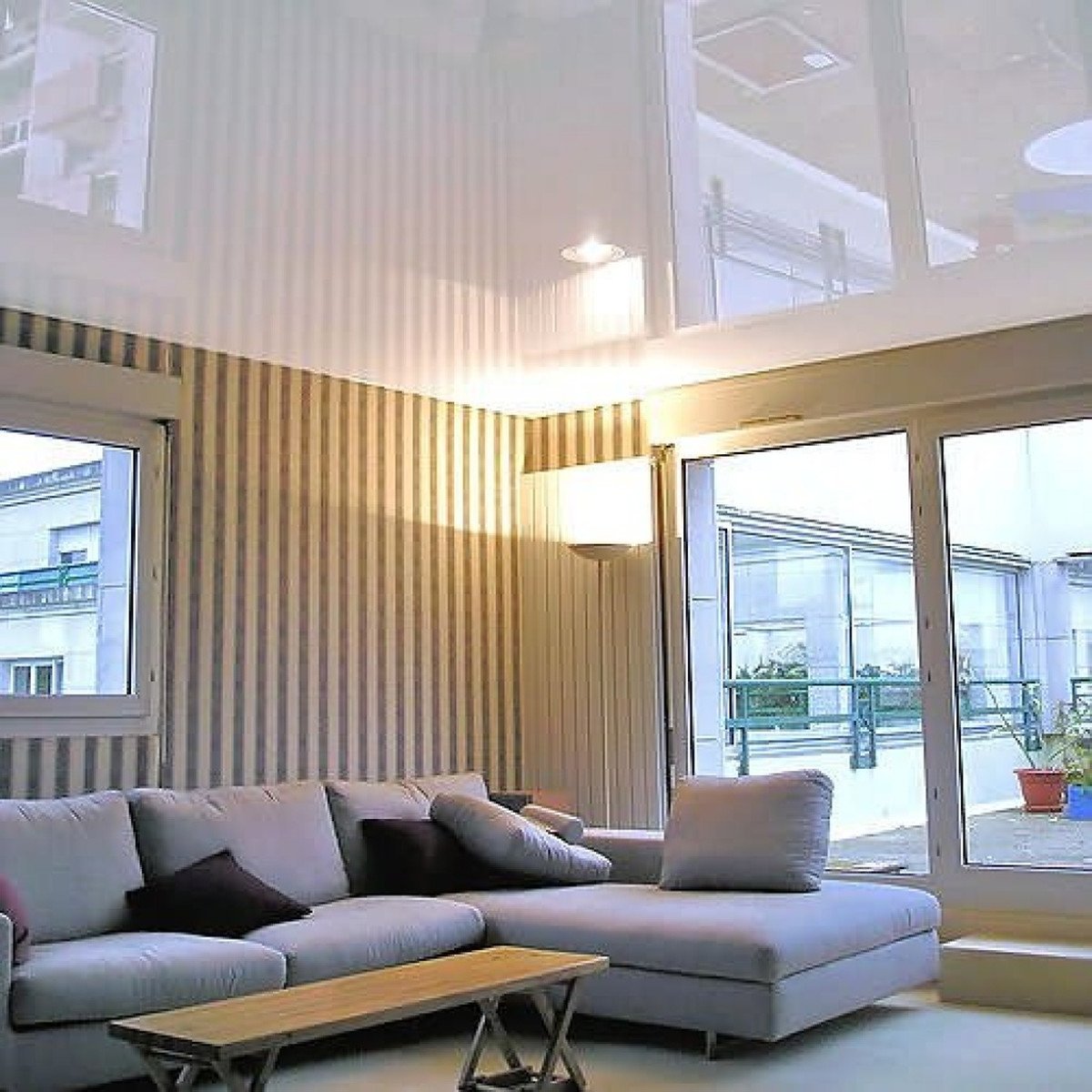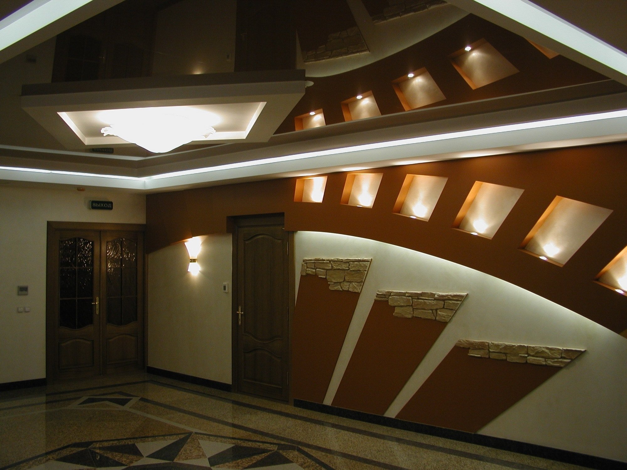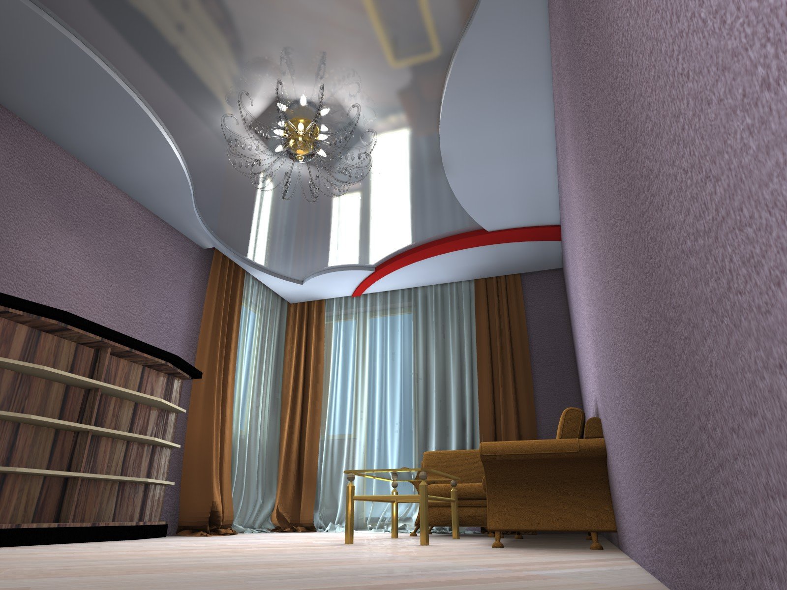 El techo no solo puede enlucirse, sino también recubrirse con pintura blanca con un brillo brillante. La superficie reflectante creará la ilusión de "fondo". Por supuesto, la tela elástica se vería más bonita, pero el diseño "consume" demasiado espacio, lo que no se compensa con el brillo.