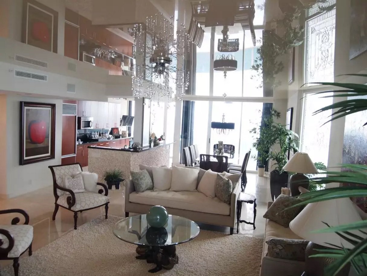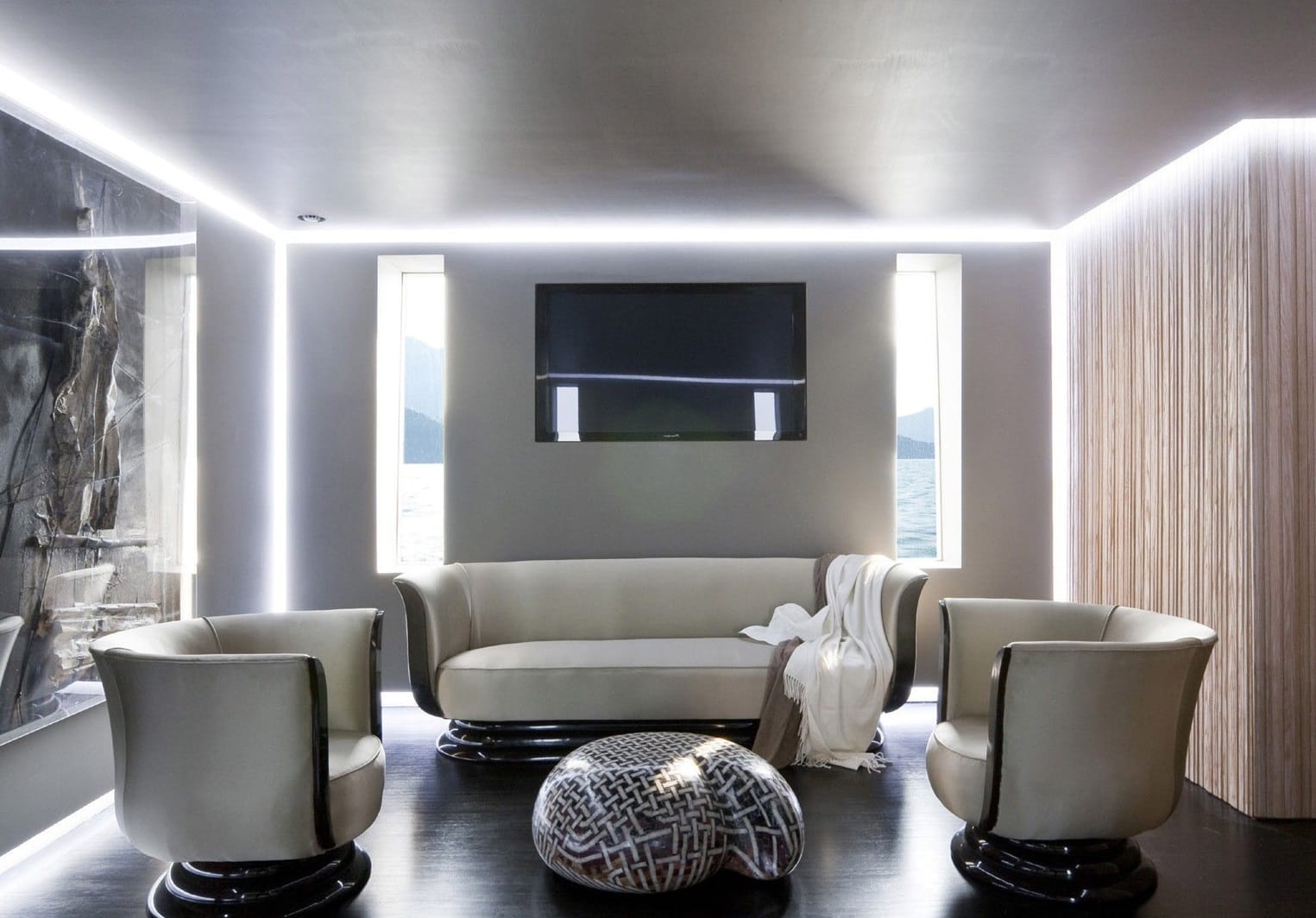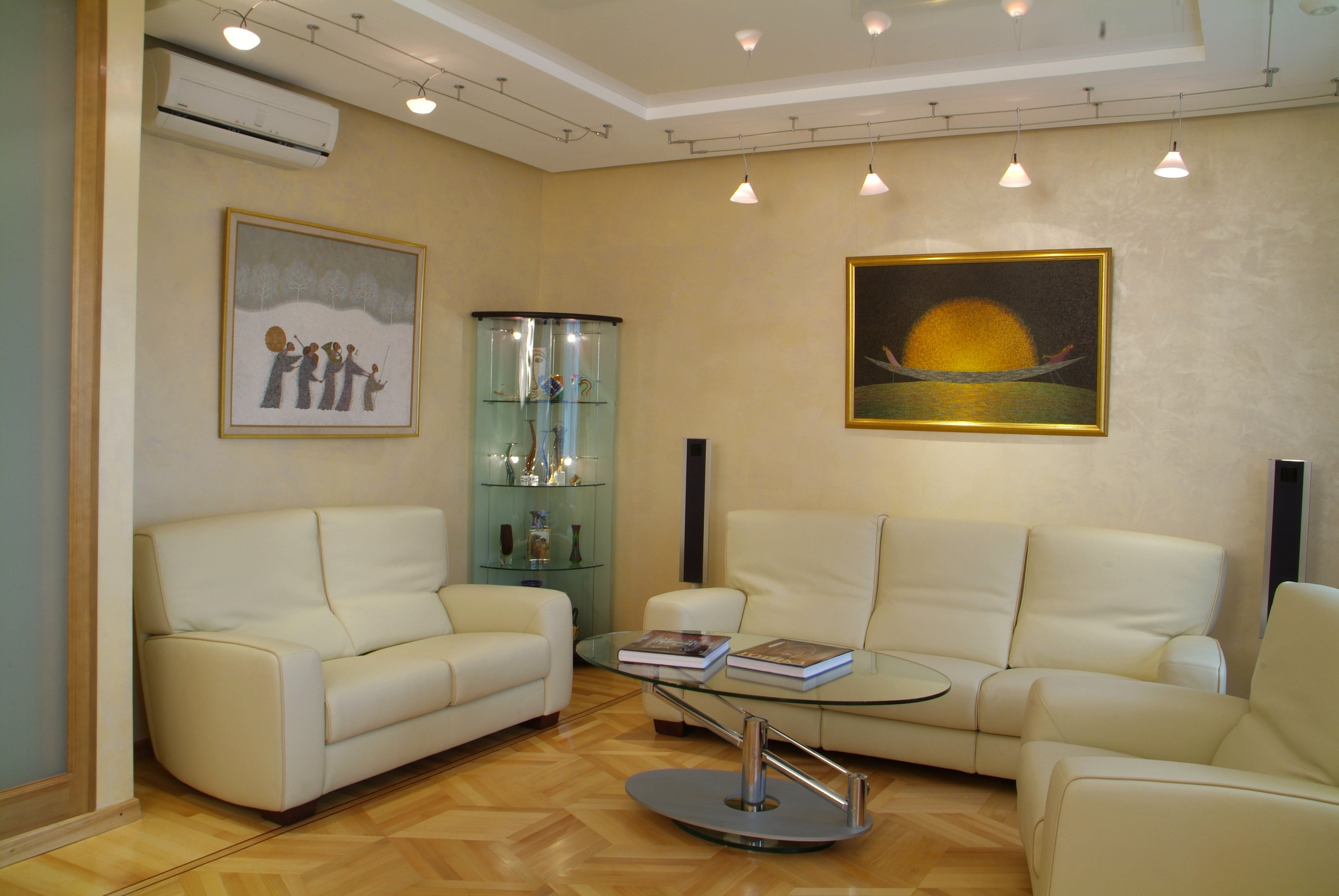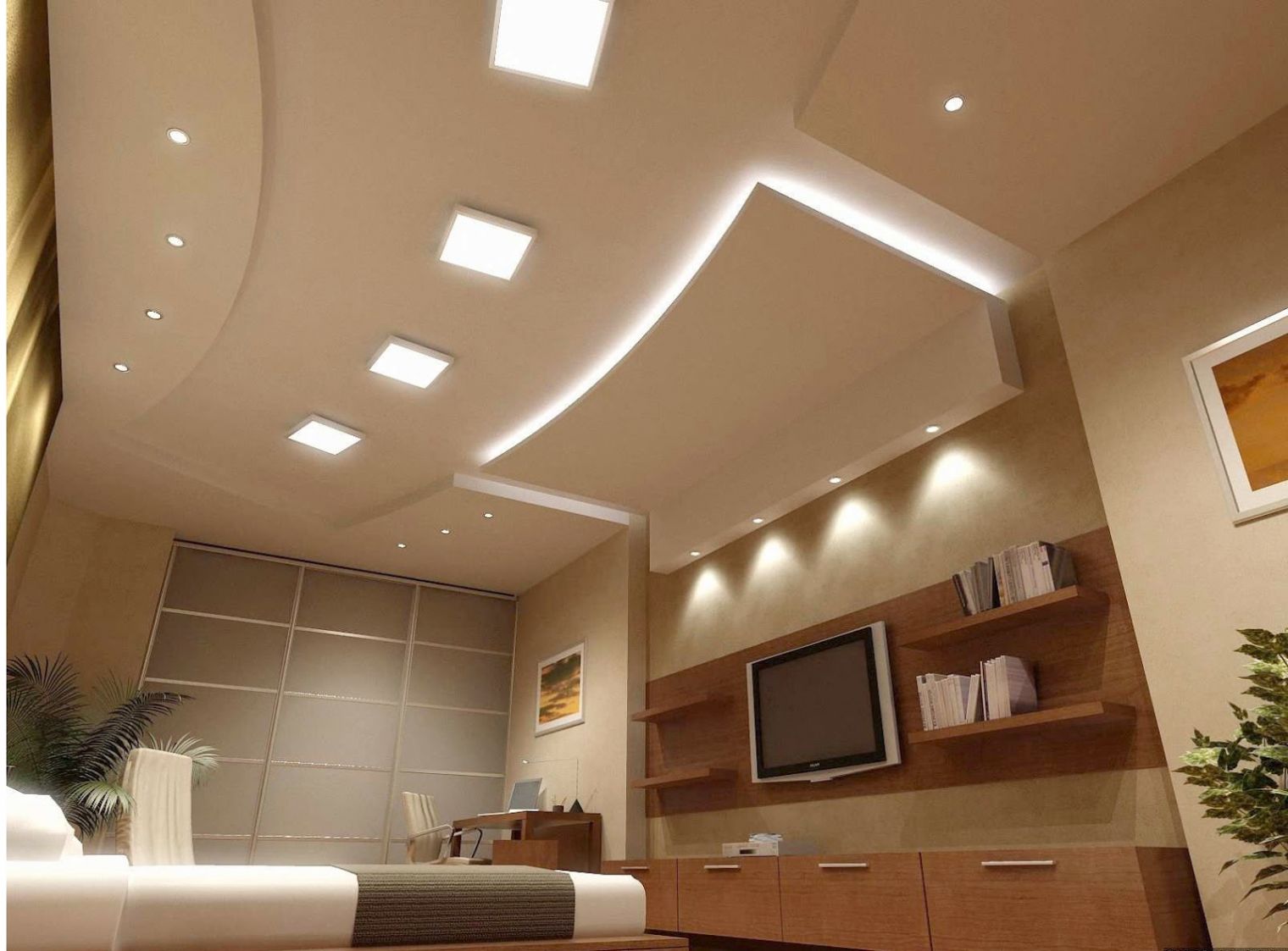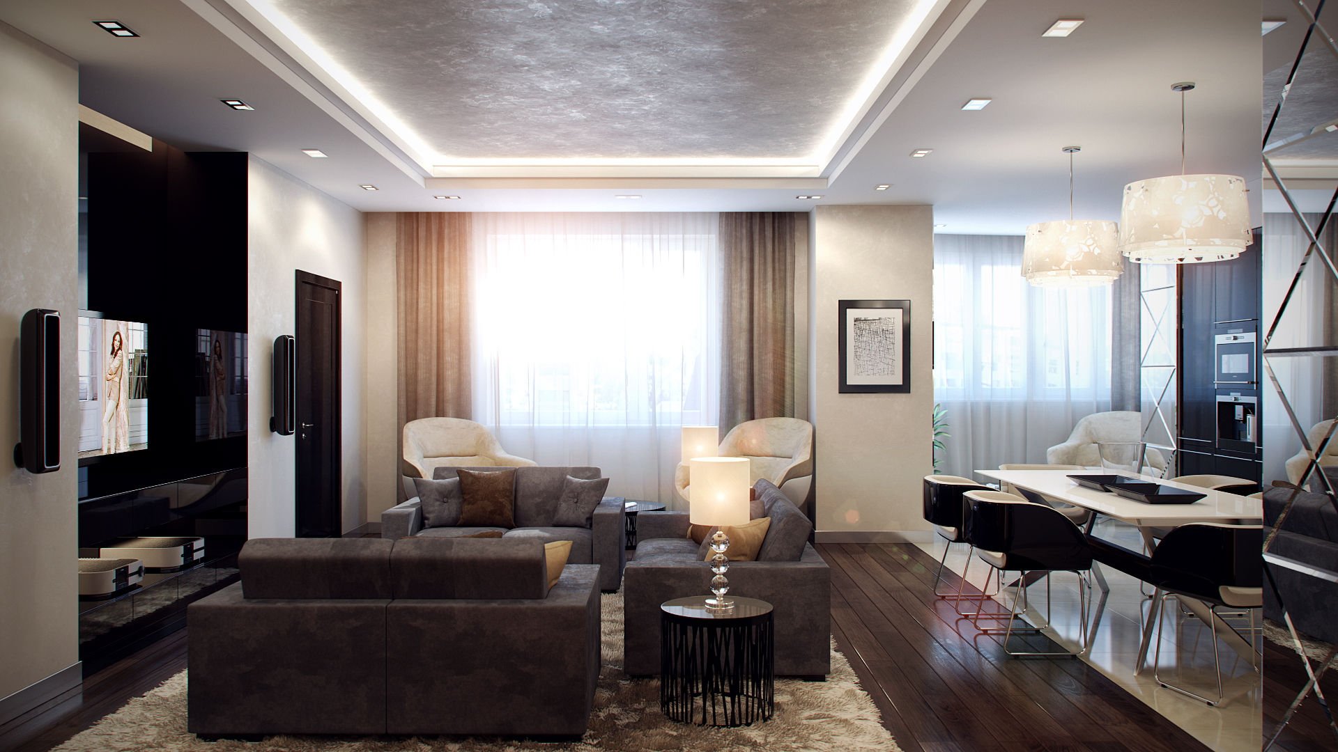 Como se mencionó anteriormente, cualquier decoración volumétrica en el techo tendrá que ser abandonada. Los candelabros también están en esta lista. Si el techo está decorado con una construcción de paneles de yeso, entonces sus protuberancias están equipadas con focos. Dicha iluminación se clasifica como decorativa, por lo que aún debe cuidar la fuente de luz principal. El candelabro central se reemplaza por un grupo de lámparas que se colocan sobre cada una de las áreas funcionales de la habitación. Los plafones de lámparas de pie y apliques decorativos no deben dirigir la luz hacia abajo, como en los interiores clásicos, sino hacia arriba.